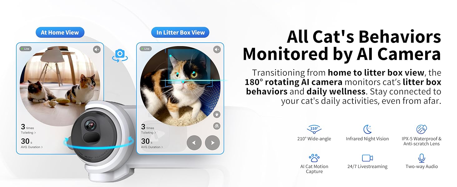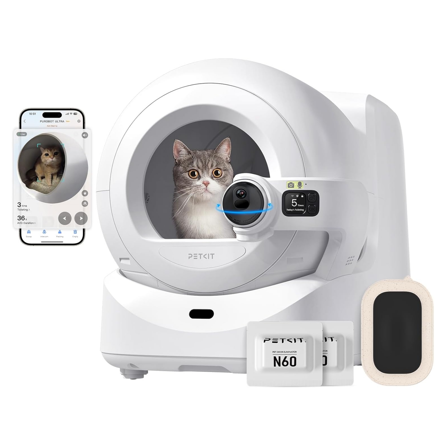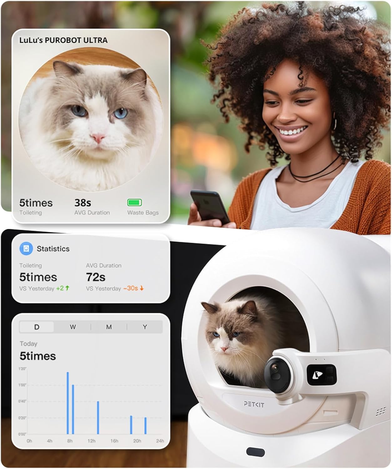 PETKIT PUROBOT ULTRA, la primera caja de arena autolimpiante para gatos con cámara AI del mundo, captura automáticamente los comportamientos de las mascotas las 24 horas del día, los 7 días de la semana con transmisión en vivo gratuita en tiempo real. El innovador reconocimiento facial distingue entre varios gatos, registra datos de uso de cajas de arena individuales y genera un informe de salud personalizado para ayudarlo a controlar el bienestar de cada gato. El audio bidireccional integrado te permite conectarte a tus mascotas en todo momento. (Algunos servicios de almacenamiento en la nube de video deben comprarse en la aplicación).