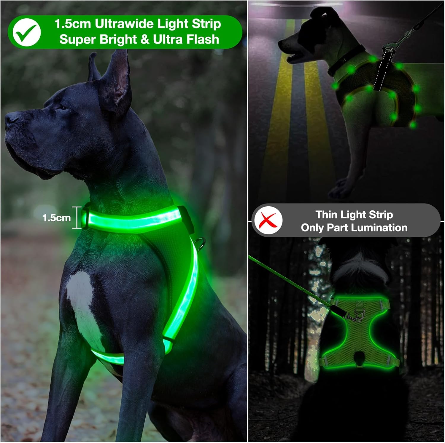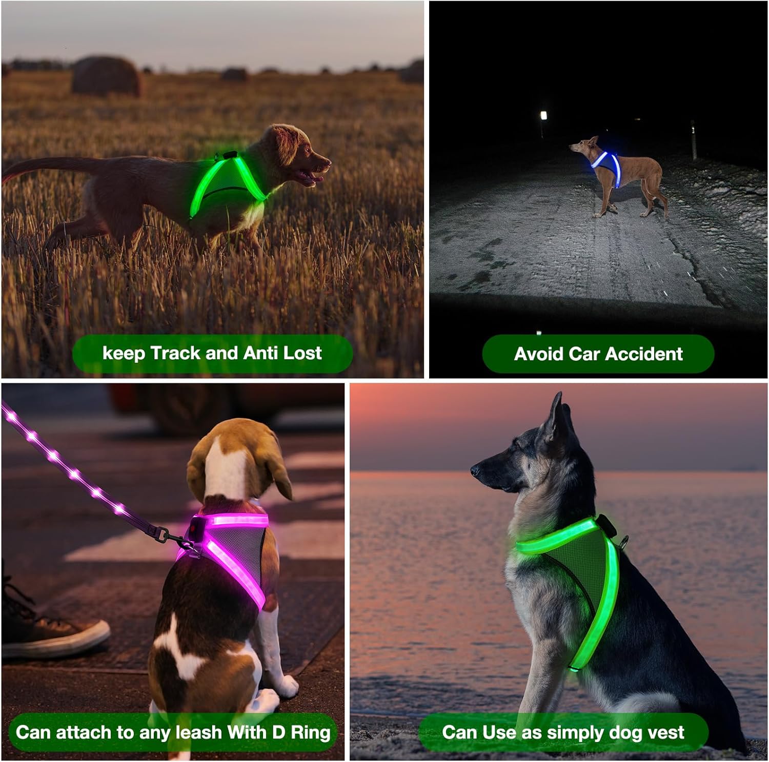 Iluminación real de 360 grados : con tira de luz súper ancha de 0.6 in, este arnés de luz para perros es súper brillante en la oscuridad, visible desde 500 pies de distancia, nunca vuelvas a perder de vista a tu perro al aire libre. Puede mantener a tu perro altamente visible por la noche. Mejora enormemente la seguridad de tu mascota, protege a tu perro de ser golpeado por autos, bicicletas o corredores. Perfecto para caminar por la noche y localizar a tu perro. Día o noche, mañana o noche, lluvia o sol, deja que tu perro salga de la casa sin preocupaciones.