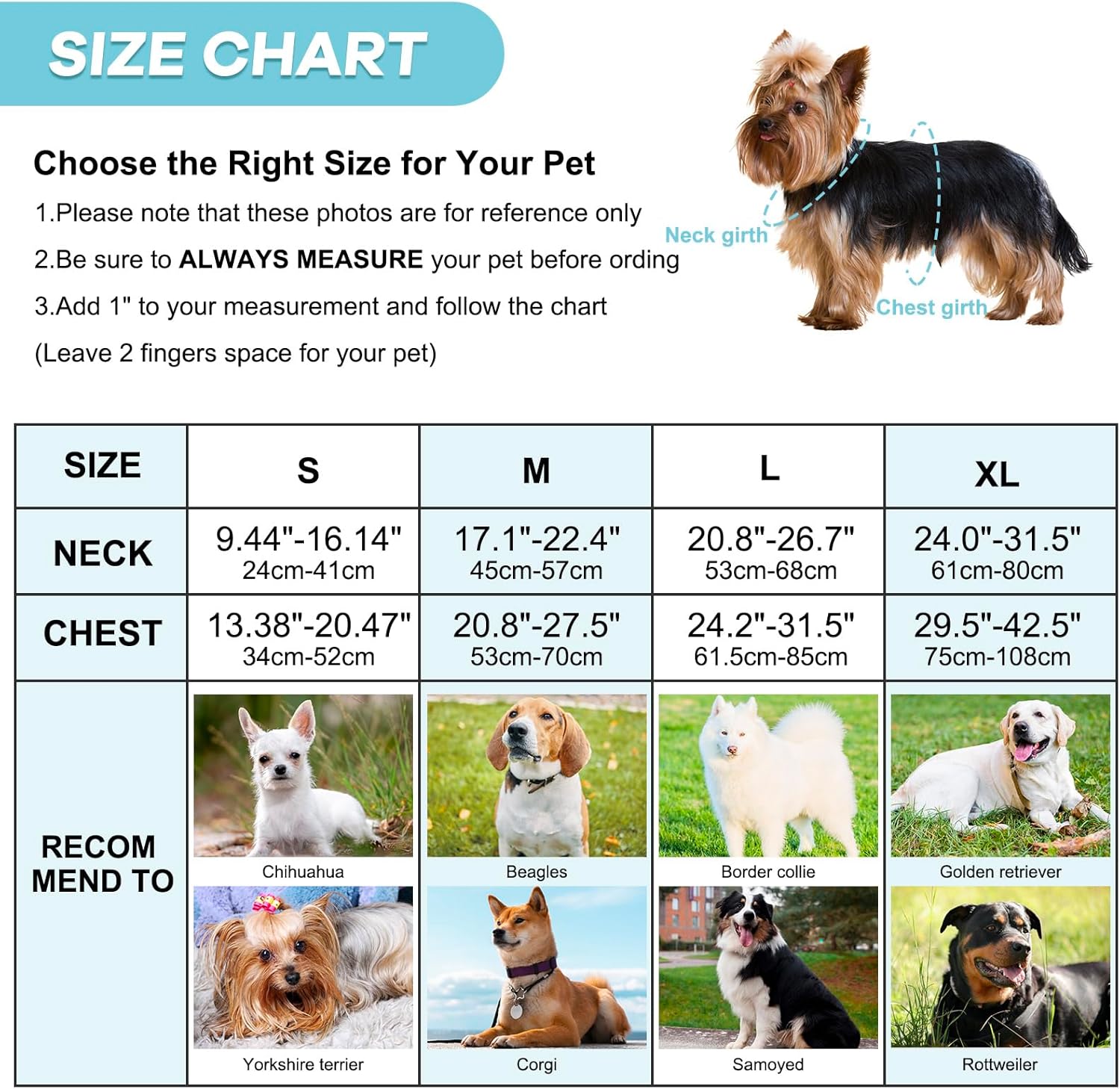 | Tallas | L Cuello ( 53-68 Cm ) Pecho ( 61-85 Cm ), M Cuello ( 45-57 Cm ) Pecho ( 53-70 Cm ), XL Cuello ( 61-80 Cm ) Pecho ( 75-108 Cm ) |