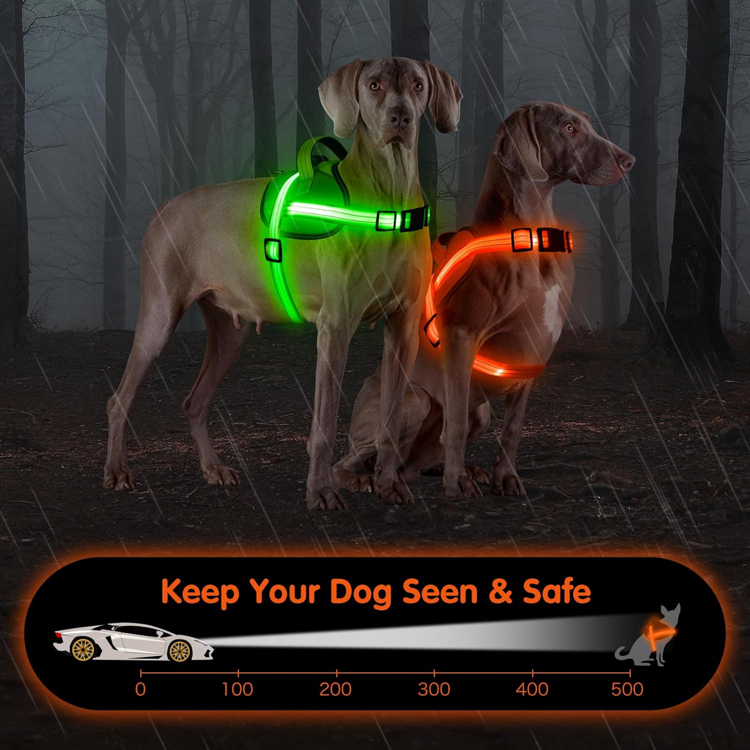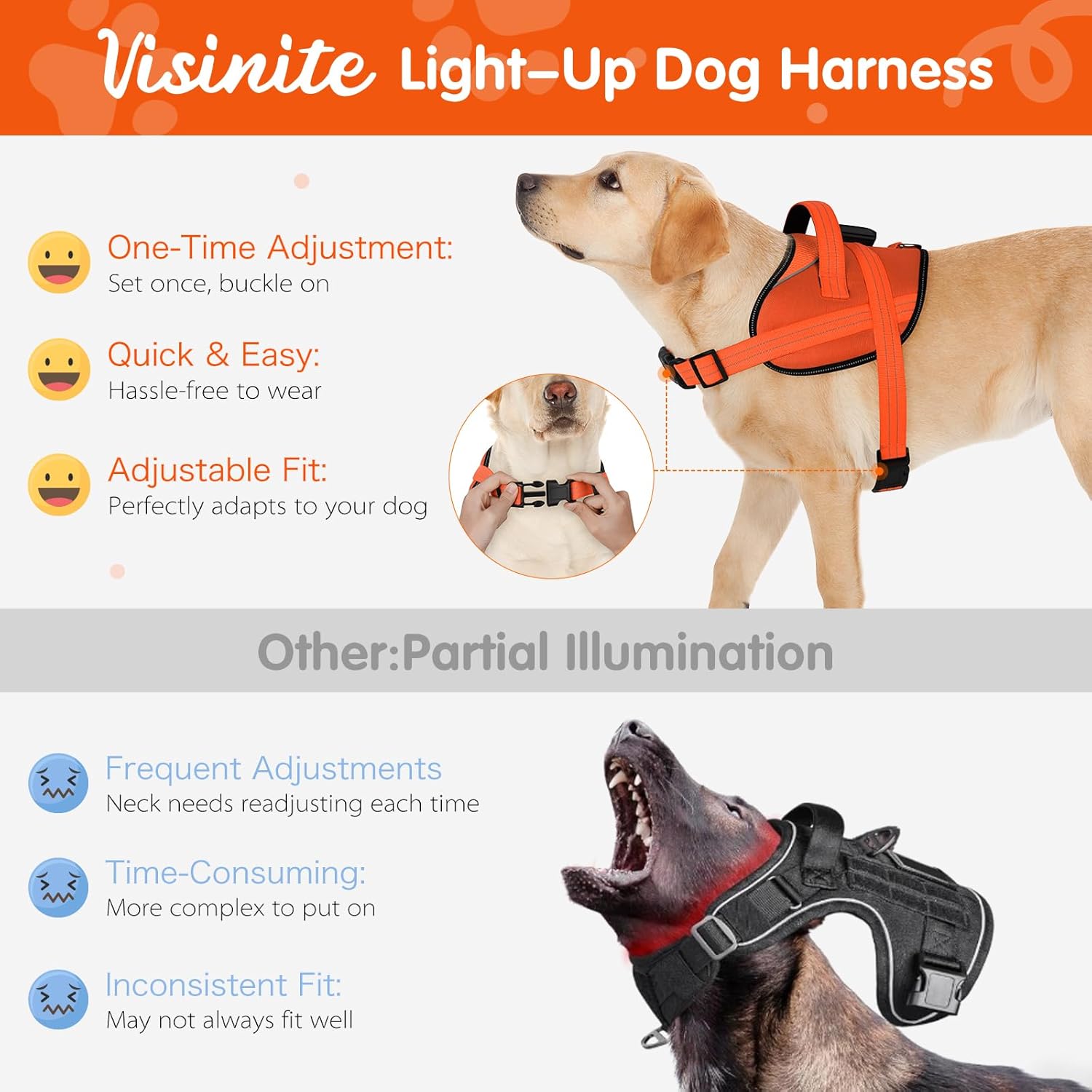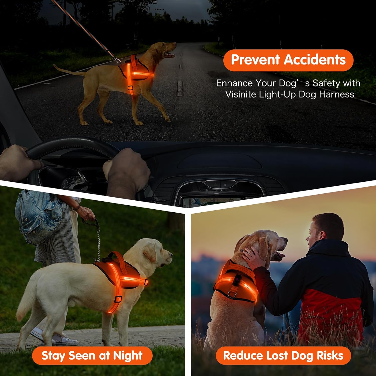Visibilidad inigualable de 360 grados: con una tira de luz LED ultra brillante de 0.6 in, nuestro arnés de luz para perros garantiza que tu perro sea visible desde hasta 500 pies de distancia. Mejore su seguridad contra peligros potenciales como automóviles, bicicletas o corredores. Este arnés de luz para perro mantiene a tu perro seguro durante paseos nocturnos, salidas tempranas por la mañana y condiciones de poca luz, asegurando que nunca esté fuera de la vista.