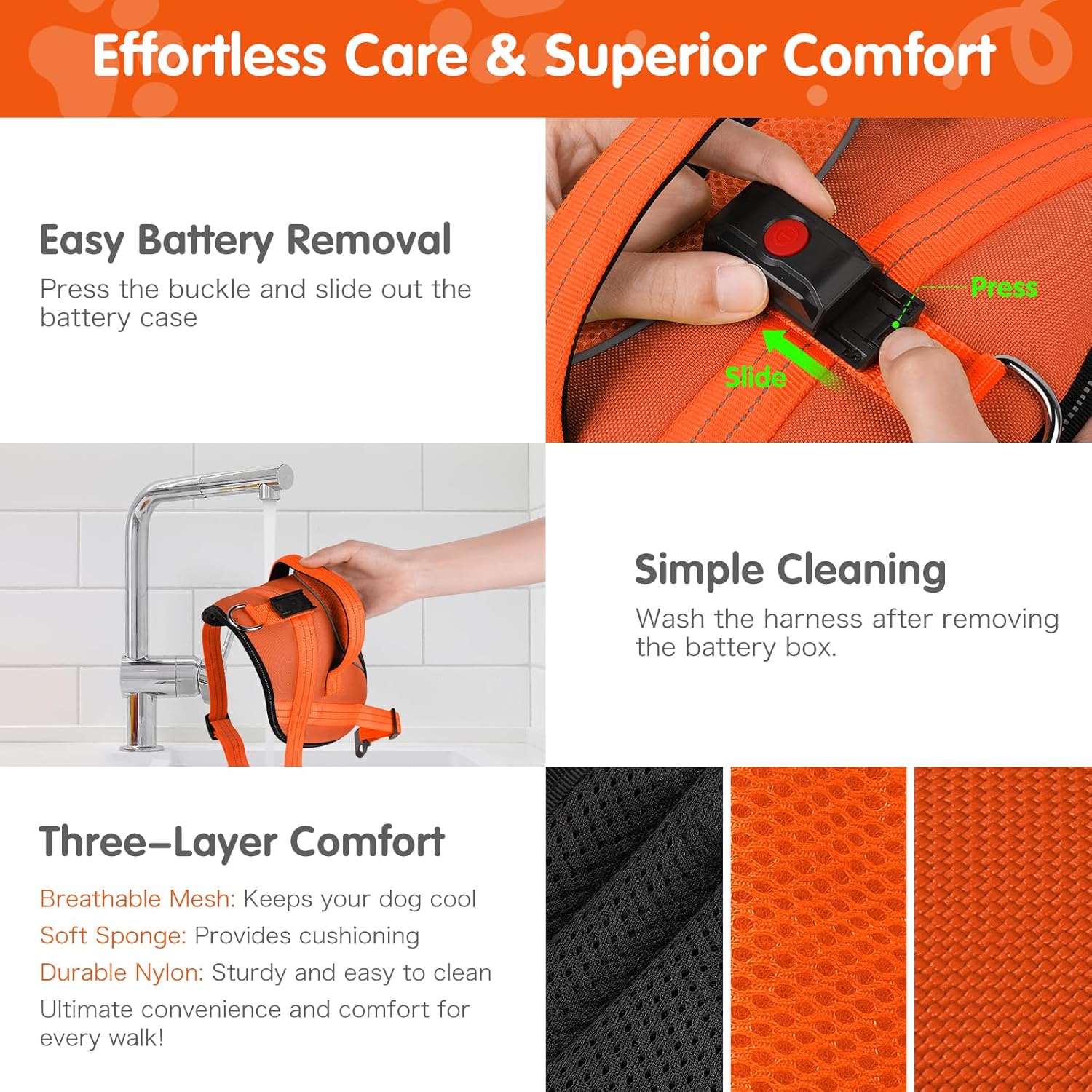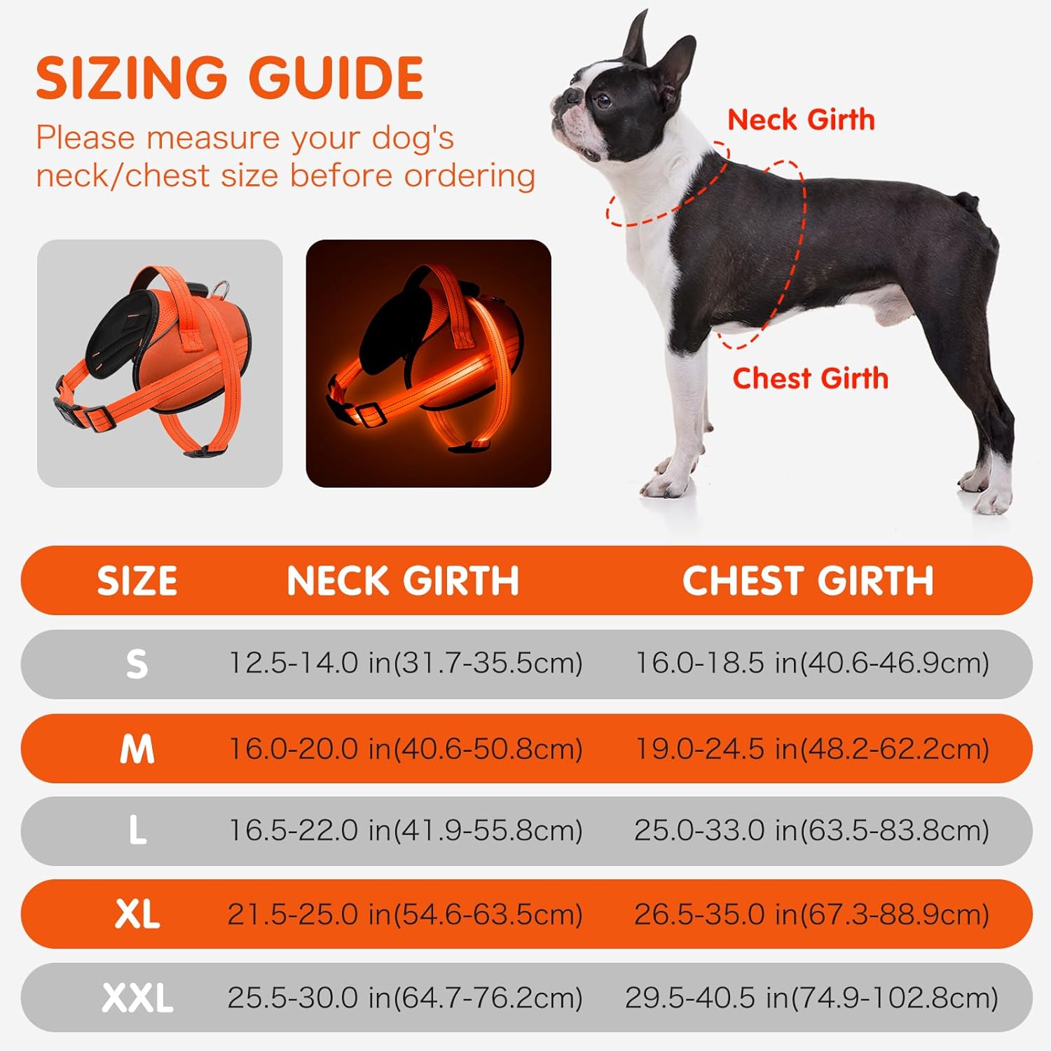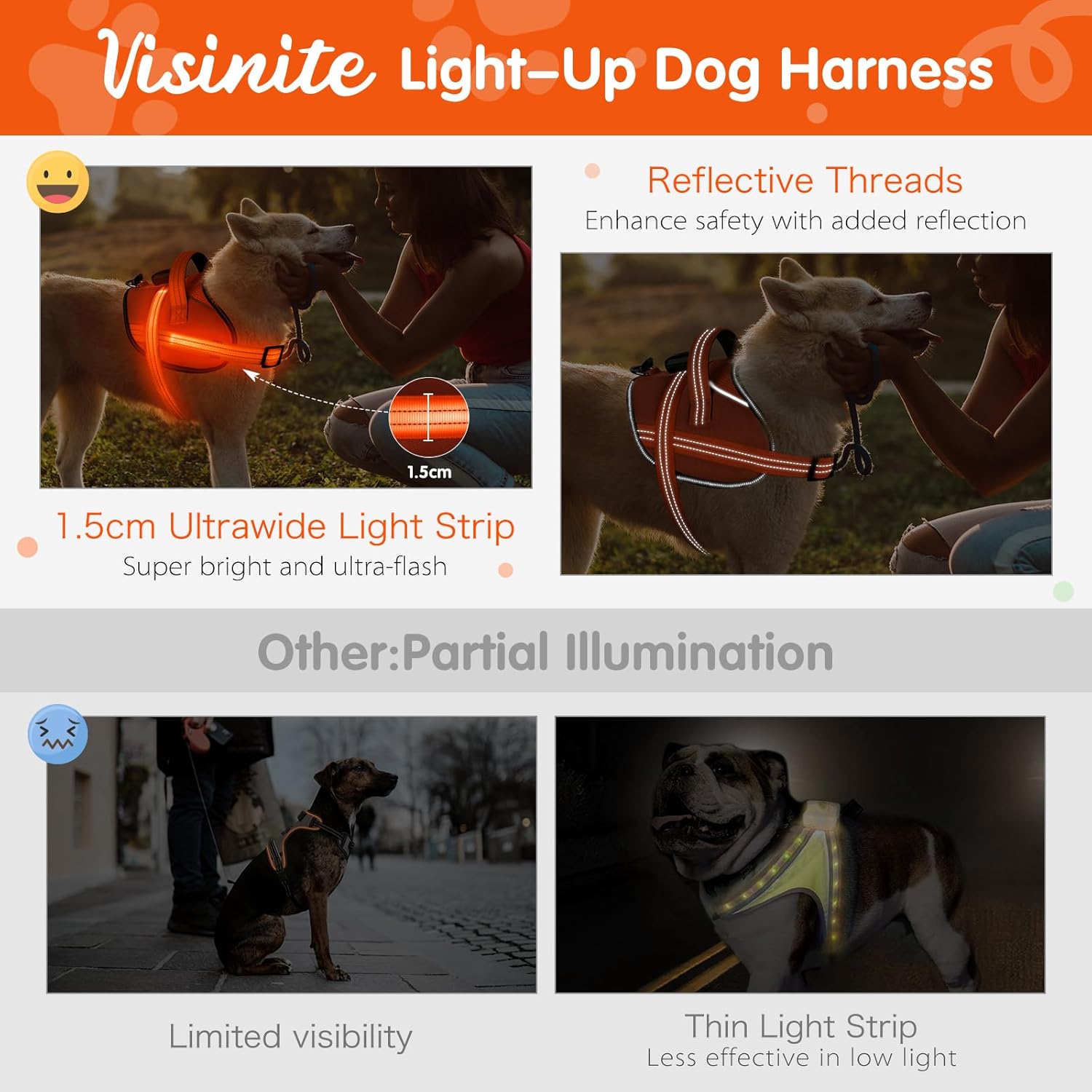 Visibilidad inigualable de 360 grados: con una tira de luz LED ultra brillante de 0.6 in, nuestro arnés de luz para perros garantiza que tu perro sea visible desde hasta 500 pies de distancia. Mejore su seguridad contra peligros potenciales como automóviles, bicicletas o corredores. Este arnés de luz para perro mantiene a tu perro seguro durante paseos nocturnos, salidas tempranas por la mañana y condiciones de poca luz, asegurando que nunca esté fuera de la vista.