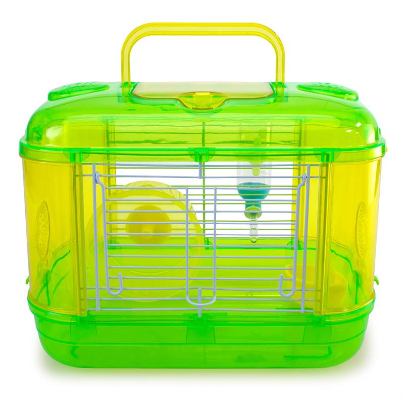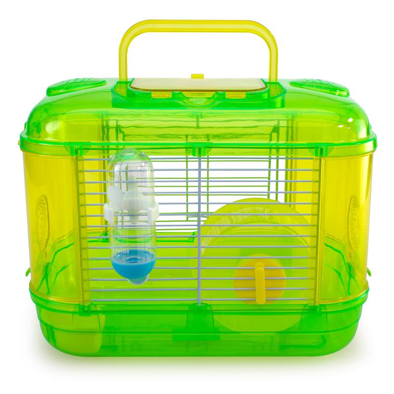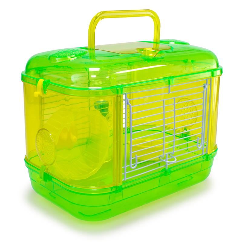 Jaula de una planta, para roedores, hecho de plástico resistente. Incluye rueda giratoria, comedero y bebedero. Disponible en color naranja, azul y rosa. Medidas: 33 x 21 x 24,5 cm