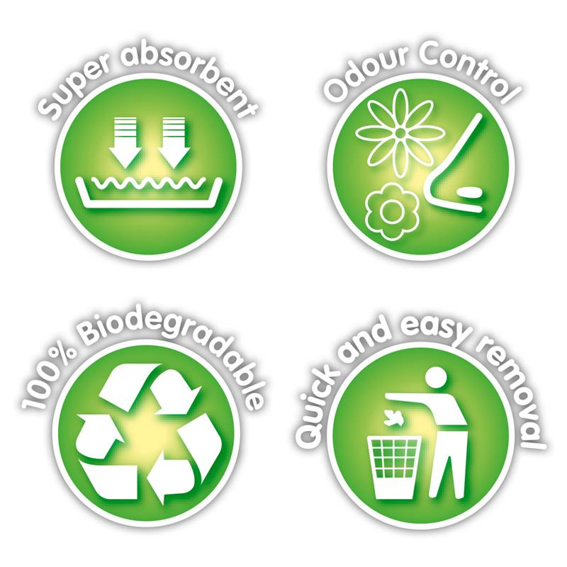 Para gatos, pájaros y roedores. Superabsorbente e inodoro. Hecho a partir de papel reciclado libre de tinta. 100% biodegradable. Superabsorvente e inodoro, fabricado a partir de papel reciclado libre de tinta.