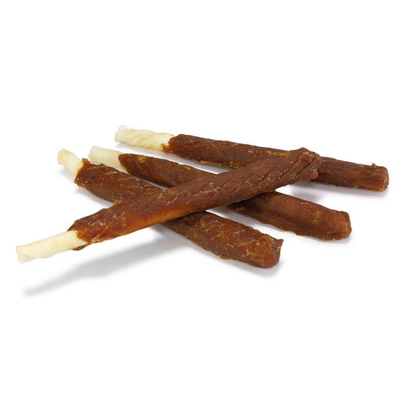 COMPOSICIÓN: Salmón 55%, Piel bovina 37%, Almidón de maíz 2%, Proteína de soja 1,5%, Emulgente Glicerina 2,2%, Edulcorante Sorbitol 2%, Sal 0,2%. Aditivos: Conservante Sorbato de Potasio 0,1% (E-202).
