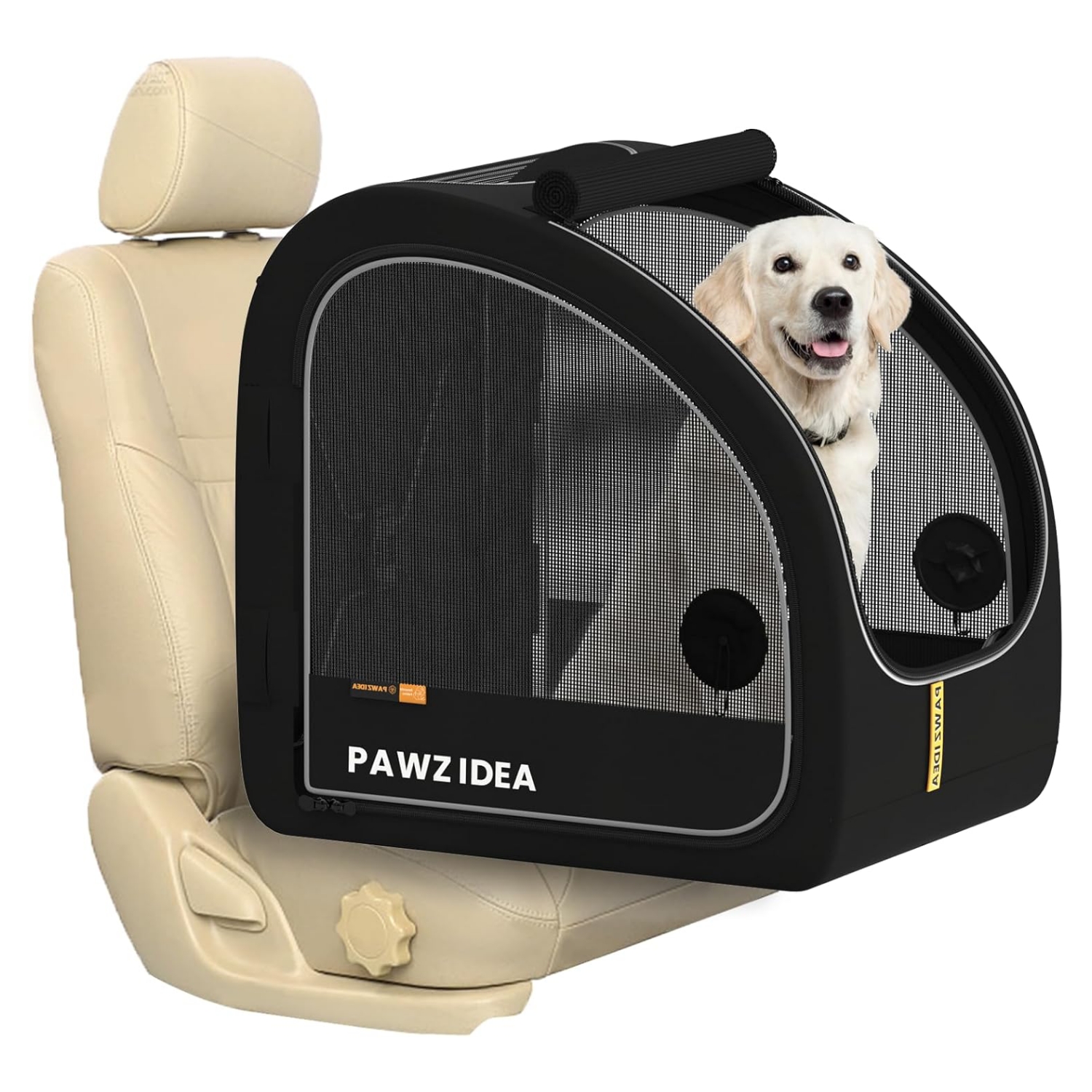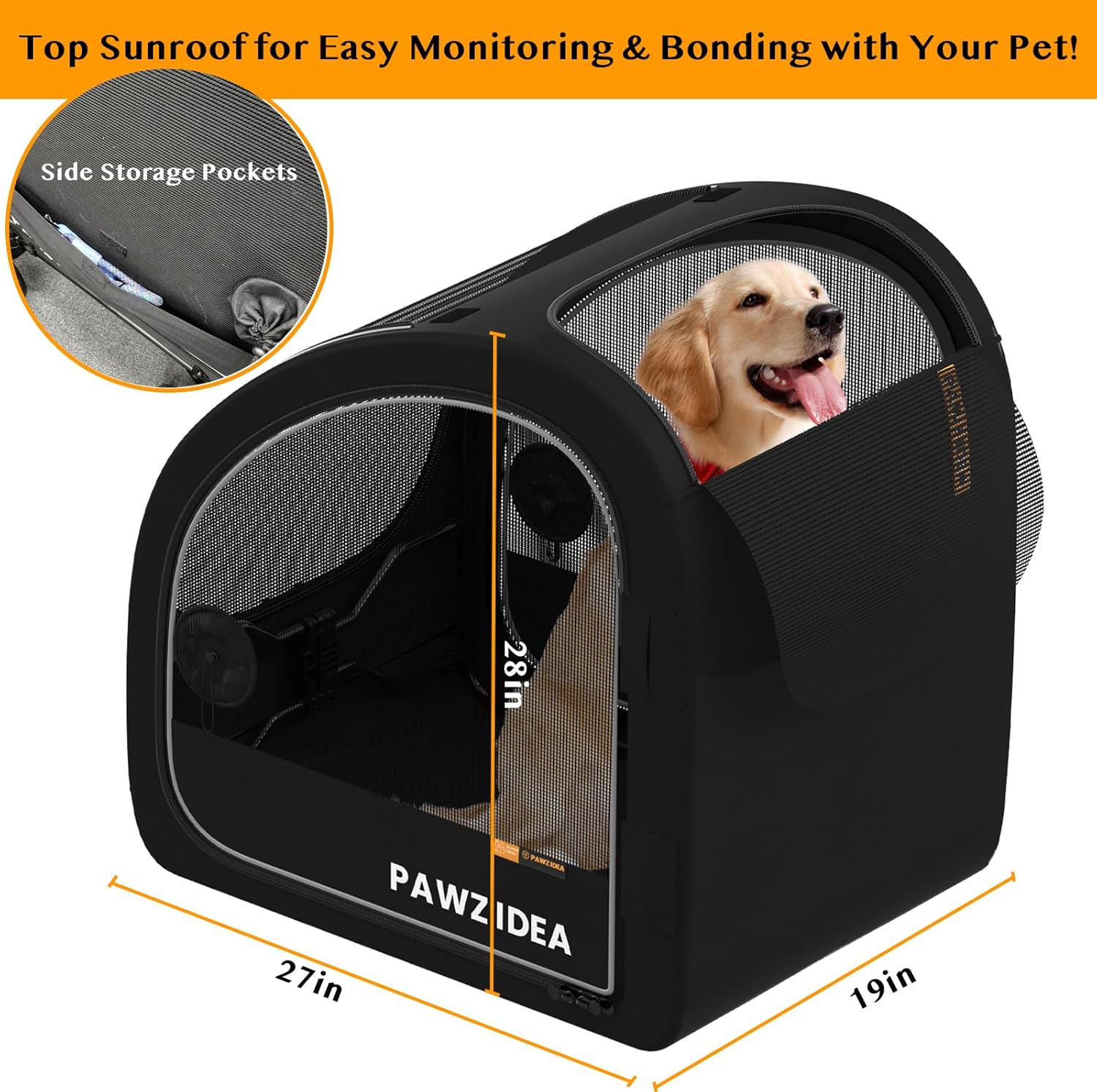 Cómoda y bien ventilada: fabricada con paneles de malla transpirable, esta perrera de lado suave garantiza una ventilación y visibilidad óptimas, ayudando a reducir la ansiedad de viaje de tu mascota. La puerta frontal de malla extragrande se puede enrollar para vistas sin obstáculos. Las amplias dimensiones (27 pulgadas de largo x 19 pulgadas de ancho x 28 pulgadas de alto) proporcionan un montón de espacio para que los perros medianos a grandes se relajen durante los viajes. El diseño elevado permite a tu perro sentarse o pararse cómodamente, proporcionando una experiencia de viaje más relajante.