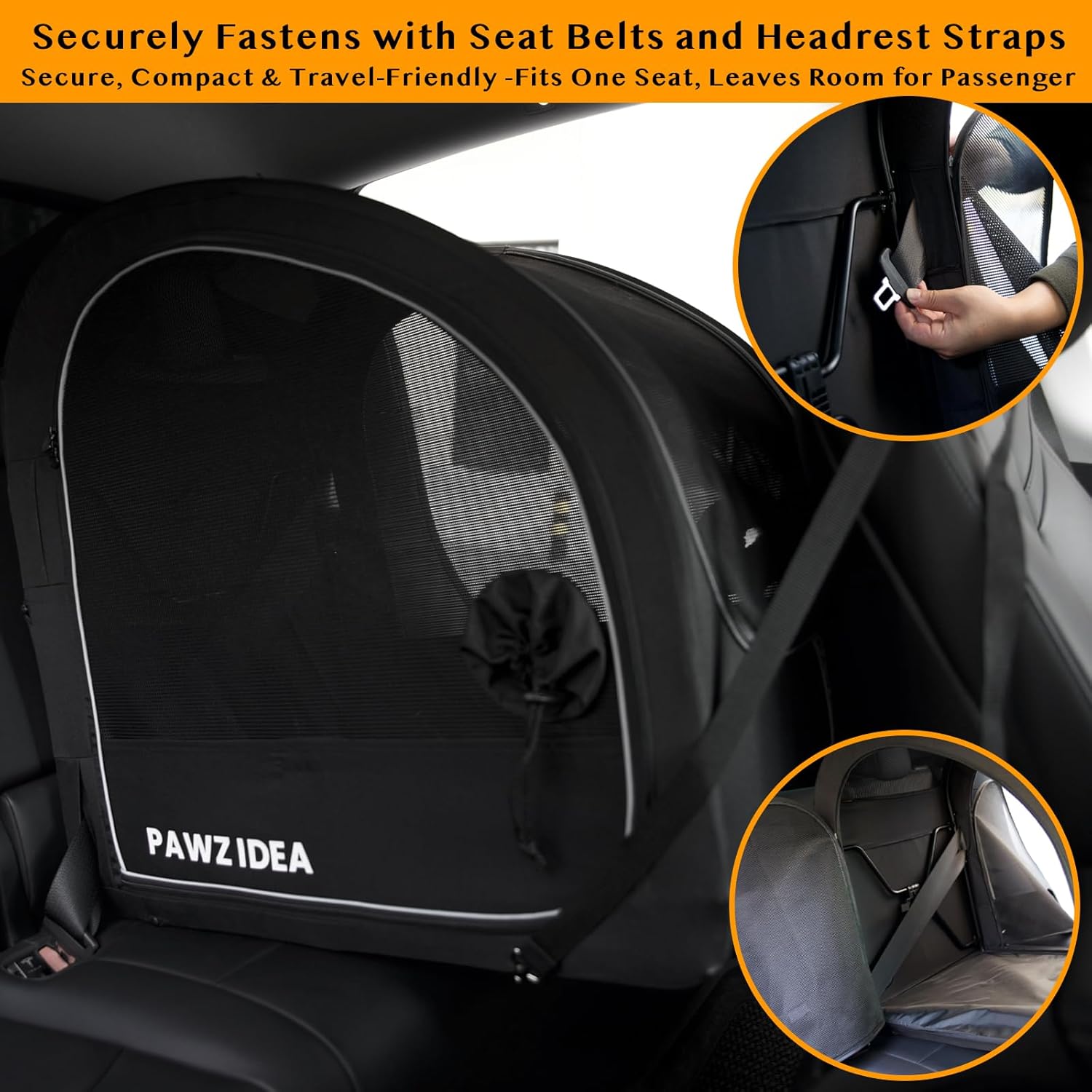 Viaje seguro y seguro: mantén a tu mascota segura durante los paseos en coche con el cinturón de seguridad y los cierres de correa para reposacabezas. Esta jaula de viaje para mascotas se mantiene en su lugar de forma segura para mayor estabilidad, lo que te permite viajar con tranquilidad. Su tamaño compacto se adapta a un asiento de automóvil, dejando espacio para los pasajeros en el asiento trasero.