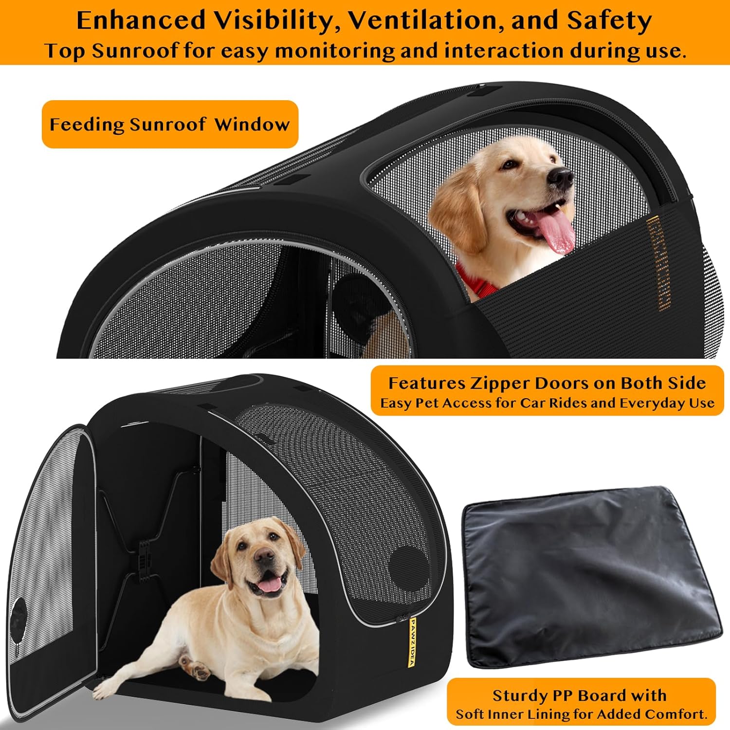 Multiusos y fácil limpieza: ya sea que se use en casa, al aire libre o durante los viajes, esta caja funciona como una casa para perros familiar y segura. La ventana de alimentación superior con cremallera hace que sea fácil interactuar con tu mascota. La funda de tela extraíble es lavable a máquina para una limpieza sin esfuerzo, mientras que las cremalleras autobloqueantes evitan fugas y garantizan la seguridad durante el uso.