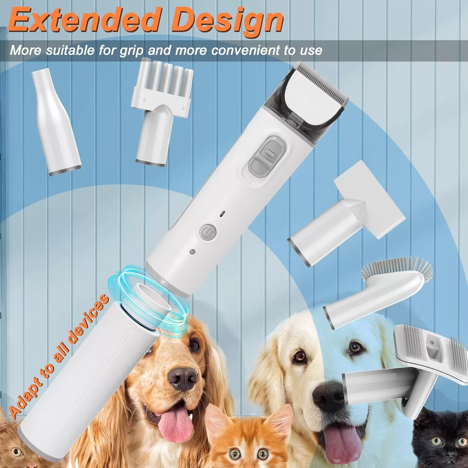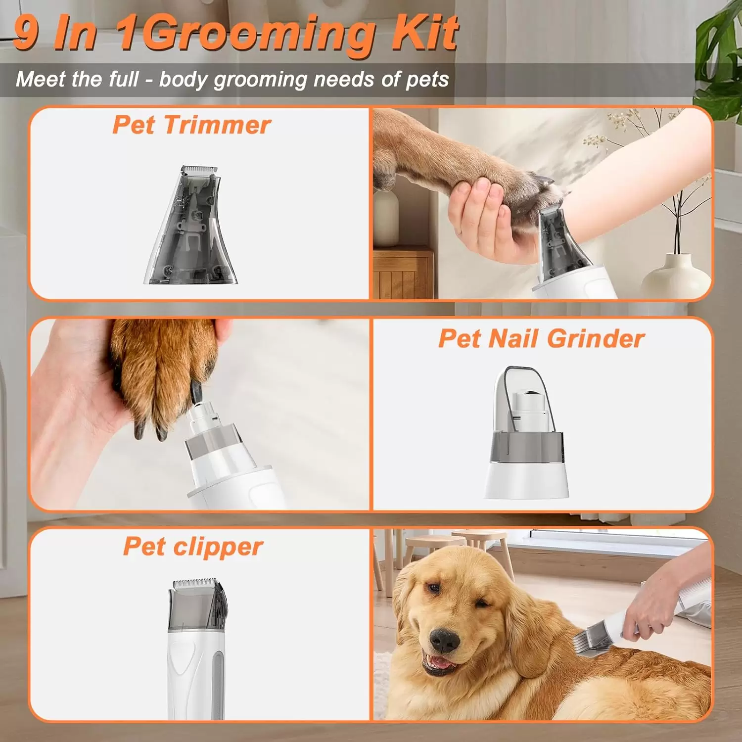 Kit de aseo para perros 9 en 1: nuestro kit de aseo para perros incluye una aspiradora de aseo para mascotas, una cortadora de pelo para perros con 6 peines guía, 1 taza de polvo extendida, 1 cabezal de corte parcial, 1 molinillo de uñas, 1 recortador de pelo, 1 peine de aguja, 1 cepillo de limpieza, 1 boquilla plana, 1 boquilla de cinco dedos, 1 boquilla redonda. Hedding*1 1 manguera flexible, 1 cepillo de limpieza pequeño y 1 bolsa de almacenamiento.