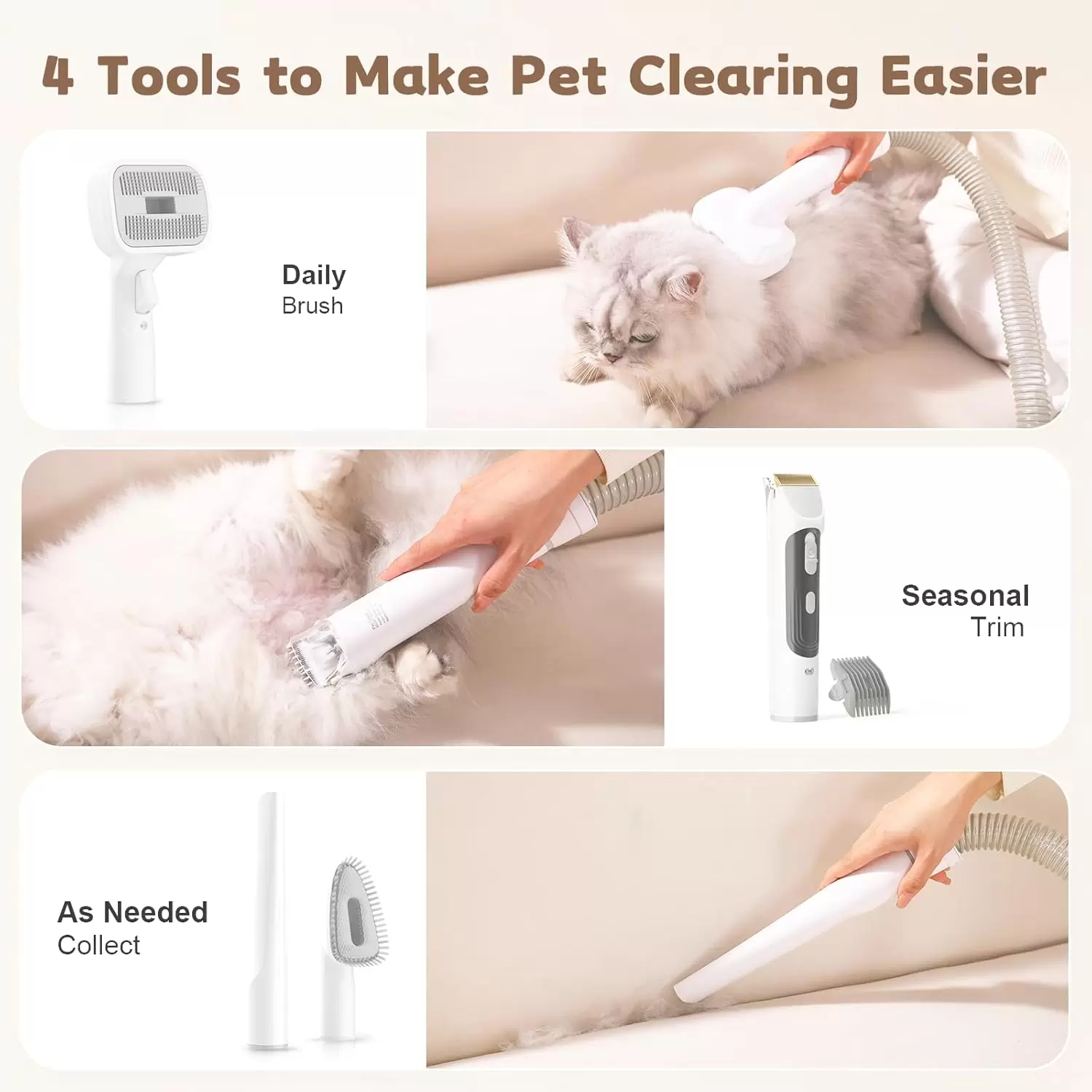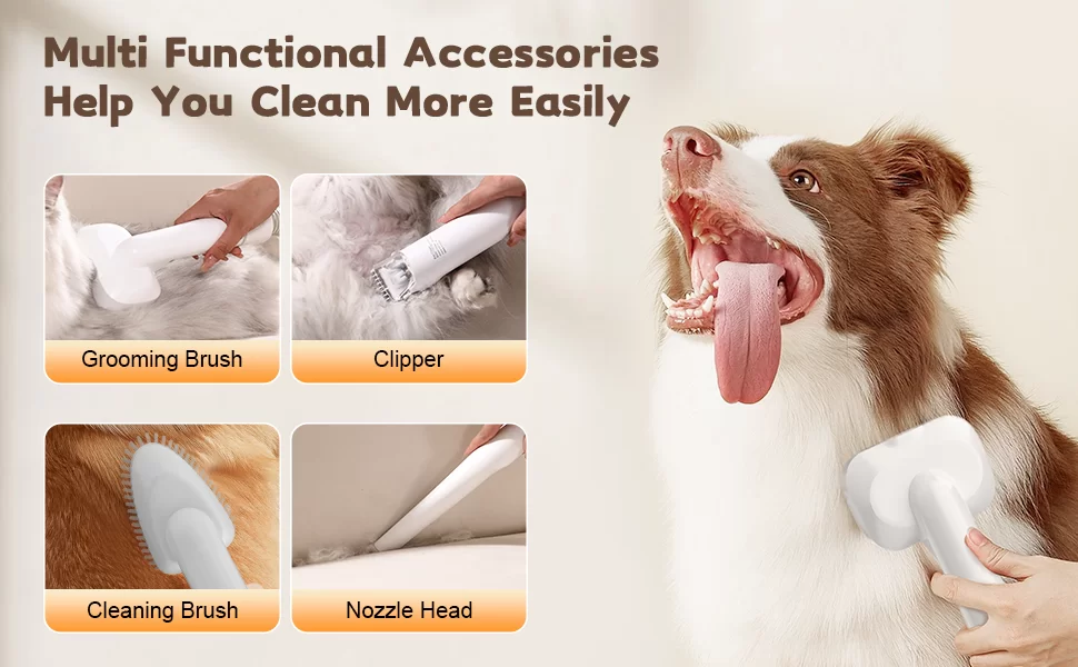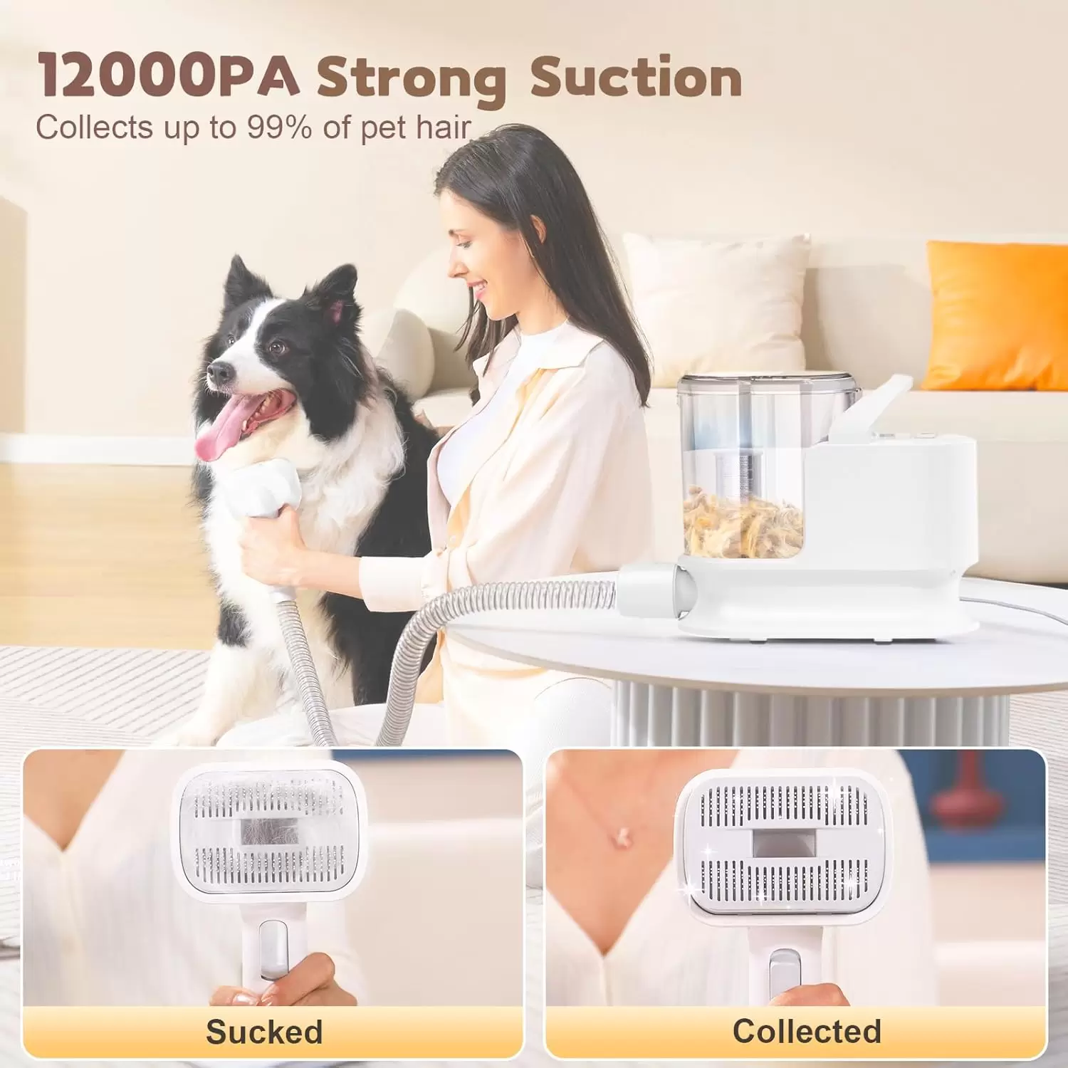 Aspiradora de aseo para perros: el kit de aseo para perros está equipado con una potencia de succión de 12 KPA, que puede recoger el 99% del pelo de mascotas en el recipiente al vacío. Al arreglar el pelo de tu mascota, el pelo suelto eliminado se succionará directamente en el recipiente de recolección de polvo al vacío.