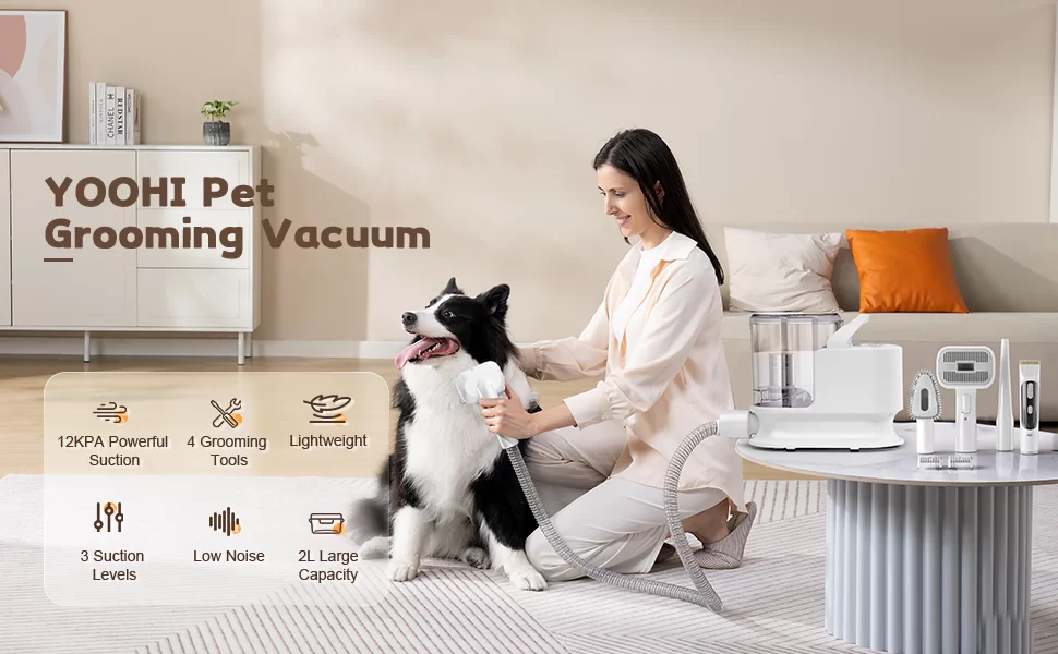 | Características especiales | Cortadores de perros con aspiradora; kit de aseo para perros 5 en 1; succión de potencia de 12 KPA; diseño de bajo ruido; taza de polvo de 2 litros |