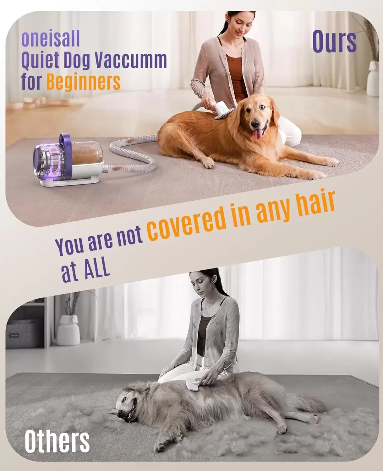 Nuestra aspiradora de aseo para mascotas está especialmente diseñada para pelar enormes y doble capa gruesa. La mascarilla de aseo única mejorada con punto seguro Mteal hace un buen trabajo eliminando el cabello suelto y la capa interna que otros. La aspiradora para perros oneisall es más eficaz para eliminar la capa inferior. Tiene el 99% del cabello que se salió. Hace que menos cabello flote alrededor de tu casa