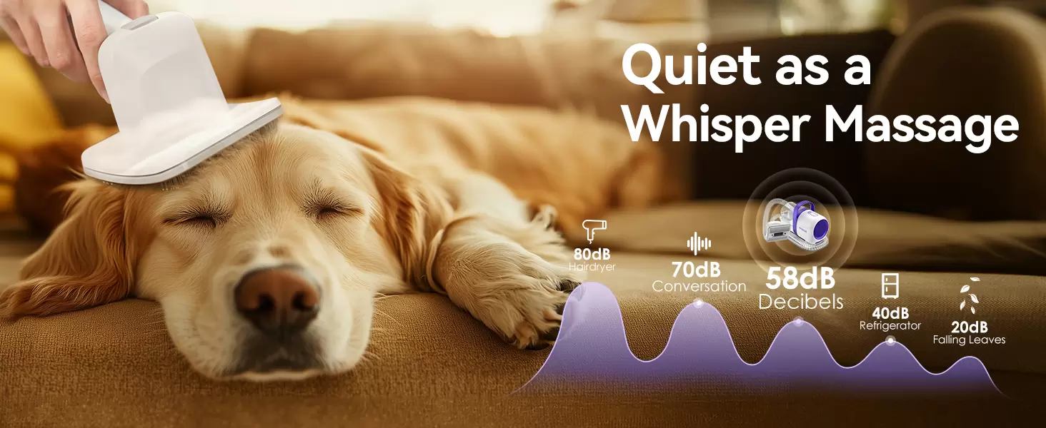 Aspiradora para perros oneisall para aseo solo con 60 db, no asusta a tus perros y puede reducir el nerviosismo del cachorro. 3 niveles de succión ajustables para elegir, incluso en la velocidad más baja, para arrebatar el cabello de los accesorios