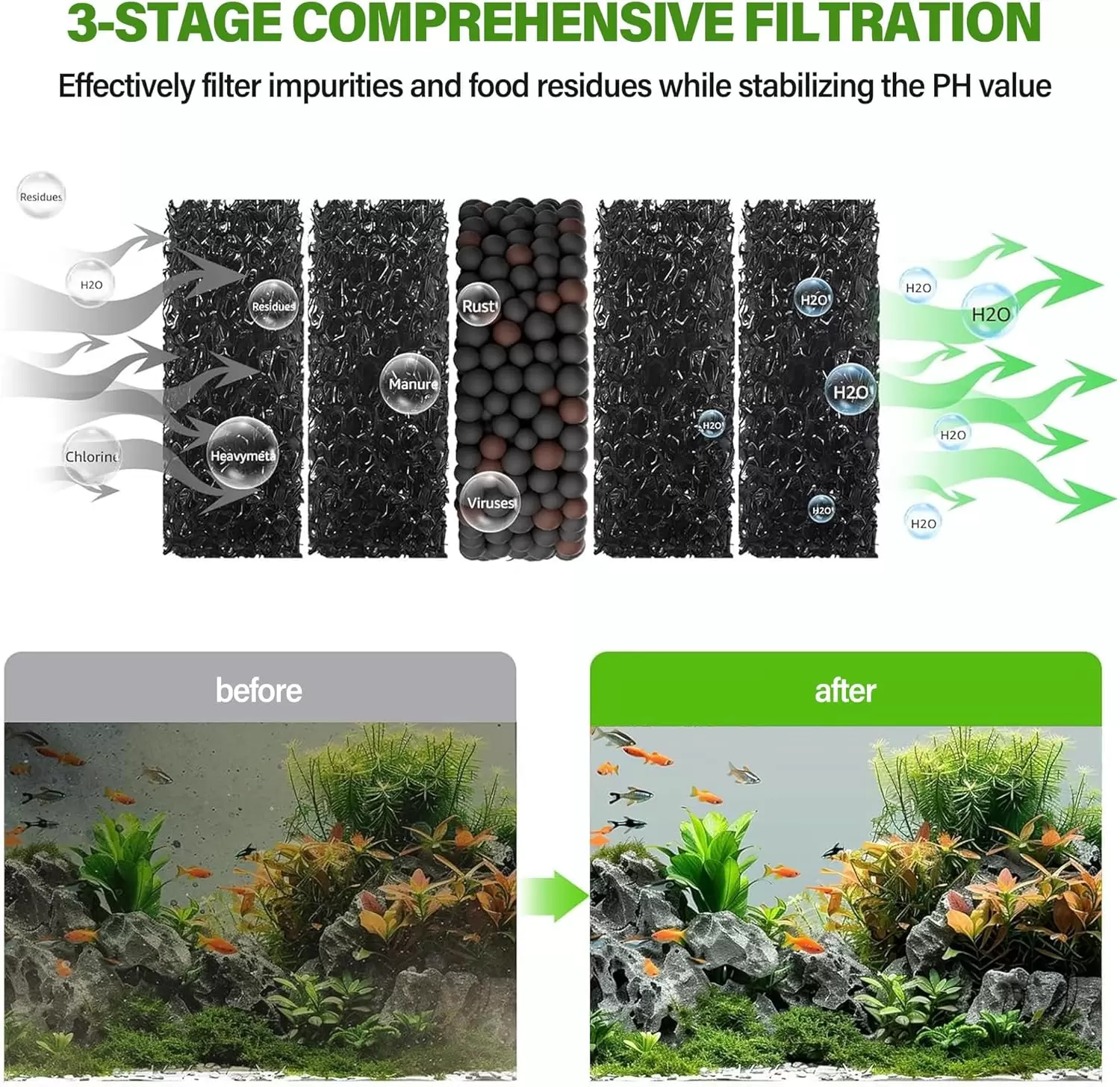 Filtración integrada de 3 etapas Taza de filtro recientemente mejorada con esponja, bola de biofiltro y bola de carbón activado, que puede filtrar eficazmente las impurezas y fluir agua limpia de regreso al acuario para filtración y circulación de agua. Es más limpio que las tazas de filtro de esponja ordinarias y las bolsas de filtro, y puede filtrar eficazmente el 99% de las impurezas en el agua. Y el medio filtrante se puede limpiar y reutilizar una y otra vez, manteniendo tu pescado sano y enérgico