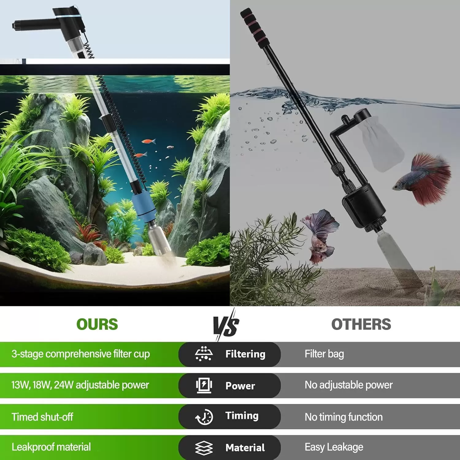 Aspiradora eléctrica 6 en 1 para acuarios: limpia grava, cambia agua y filtra con motor de 24W. Potencia y temporizador ajustables. Filtración triple reutilizable. Ahorra 90% de tiempo.