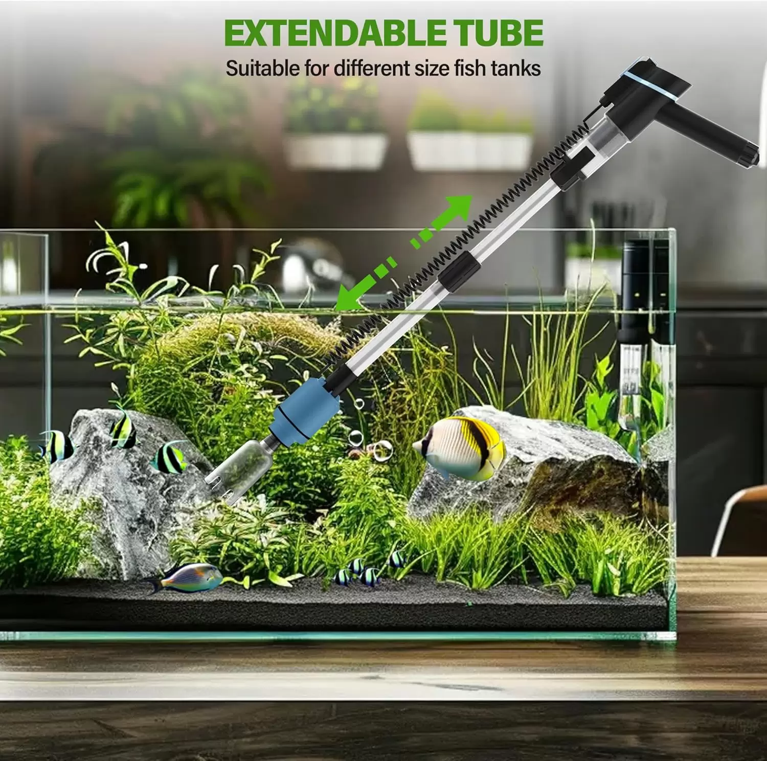 Adecuado para todos los tanques de peces: esta aspiradora de grava para peceras está diseñada con tubo telescópico ajustable de 5.9 in y manguera de extensión de 4.9 ft, la longitud se puede ajustar de acuerdo con el tamaño de la pecera o el nivel del agua, es adecuado para todas las alturas de peceras. Nota: El interruptor independiente externo no es impermeable, por favor manténgalo alejado de la fuente de agua.