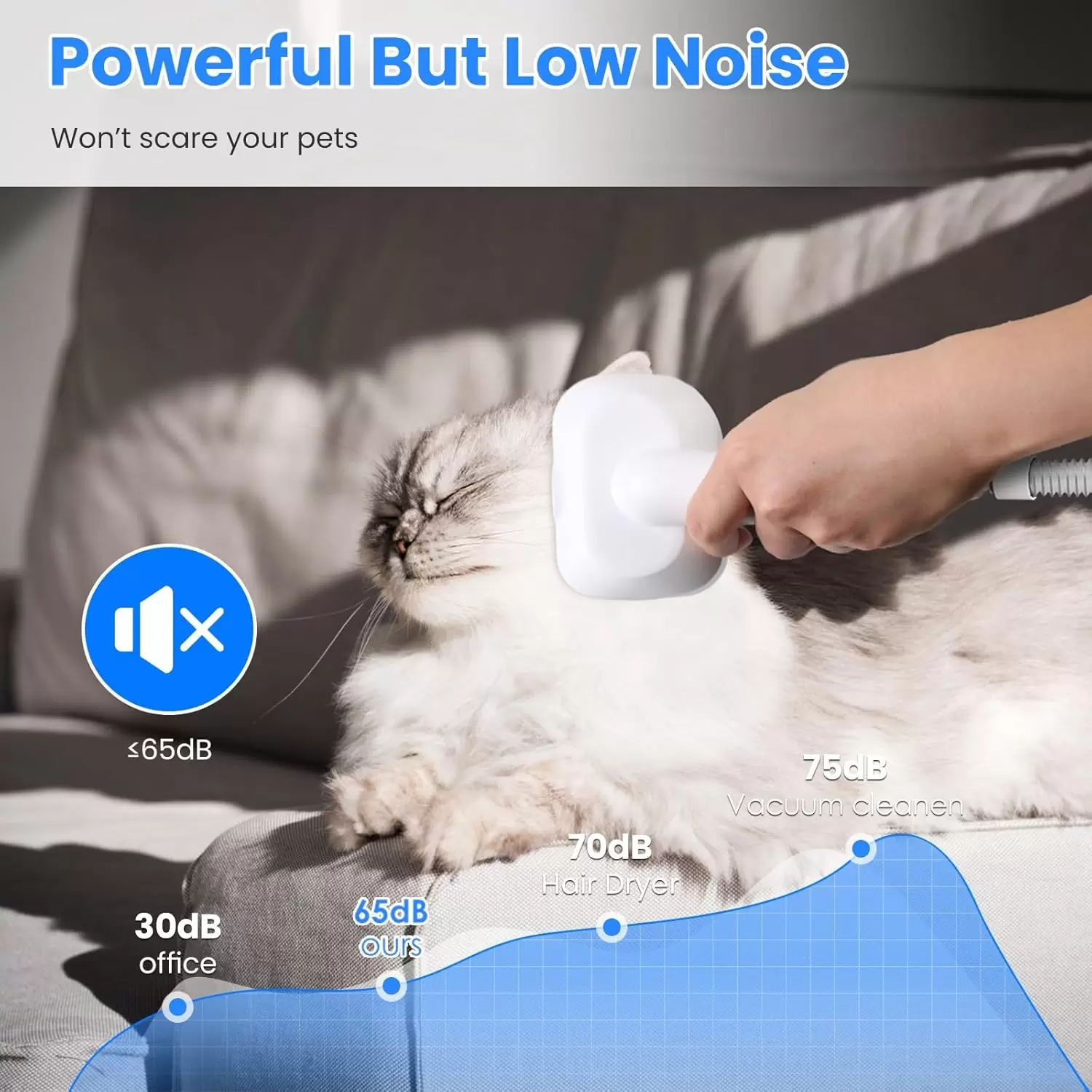 *Experiencia de aseo silenciosa y cómoda**: las mascotas son sensibles al ruido, por lo que nuestra aspiradora de aseo está diseñada con tecnología especial de reducción de ruido, que funciona a un bajo nivel de sonido de menos de 65 dB. Esto hace que el proceso de aseo sea mucho más cómodo para tu mascota, reduciendo la ansiedad y el estrés. Para facilitar aún más a su mascota, le recomendamos un suave masaje previo al aseo y una introducción lenta al proceso.