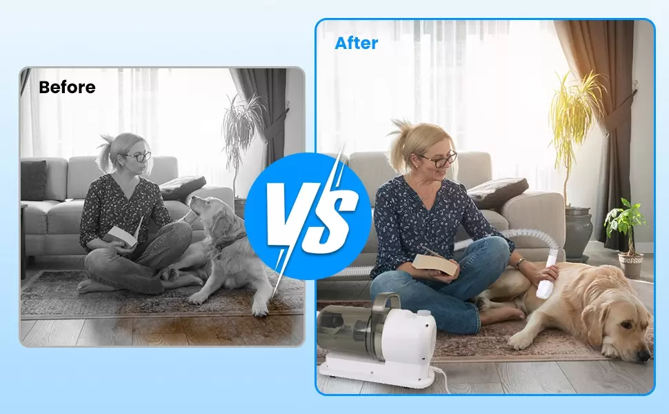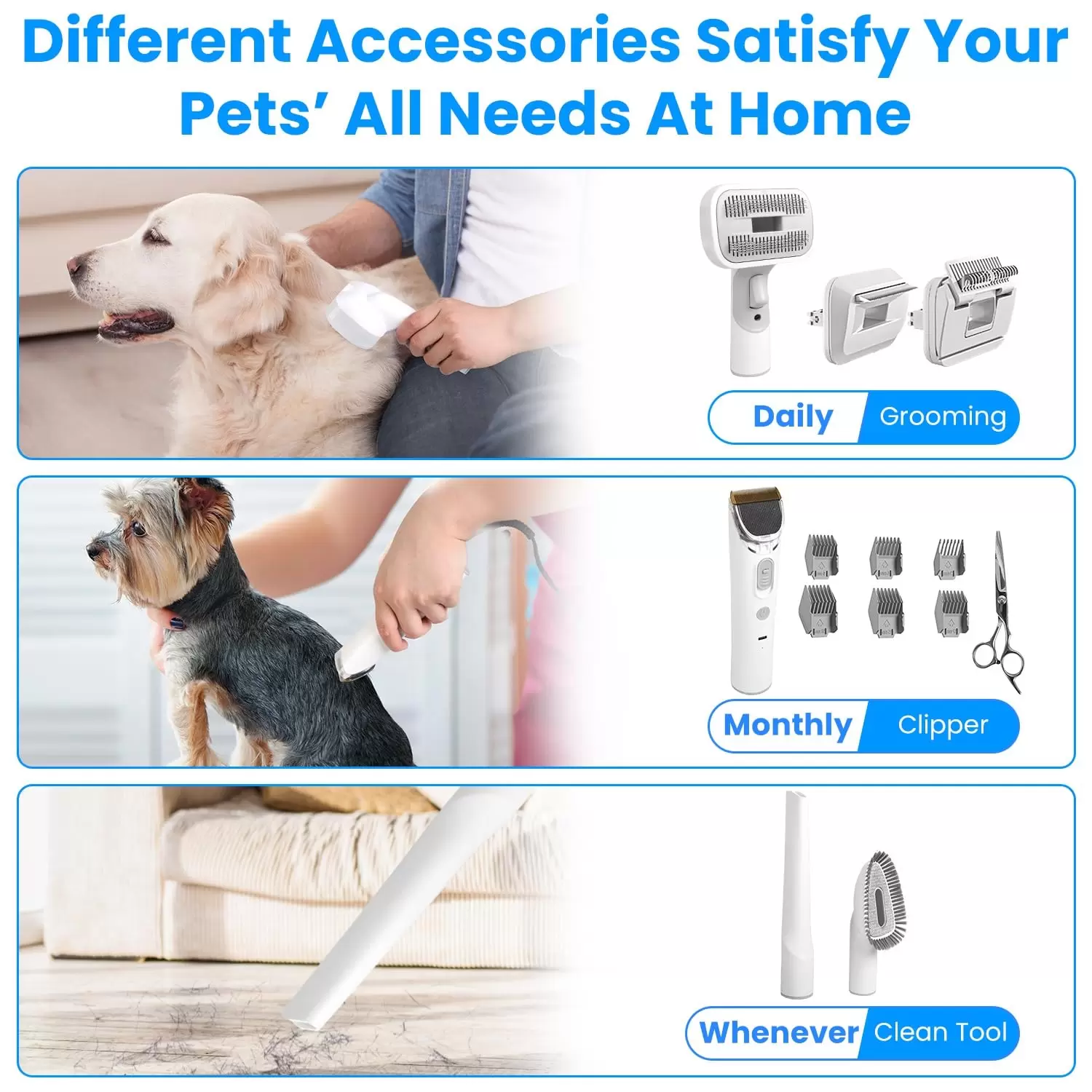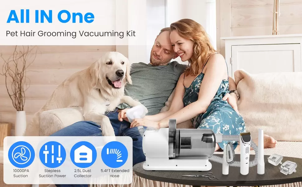 Aseo y aspirador de doble función**: ¿Cansado de lidiar con el pelaje en toda tu casa después de preparar a tu mascota? Nuestro kit de aseo para perros **7 en 1** no solo recorta y peina a tu mascota, sino que también cuenta con una potente succión que recoge el pelo suelto durante el proceso de aseo, manteniendo tu espacio libre de pelo. Di adiós a limpiar los pelos perdidos y disfruta de un ambiente ordenado y sin pelos con cada sesión.