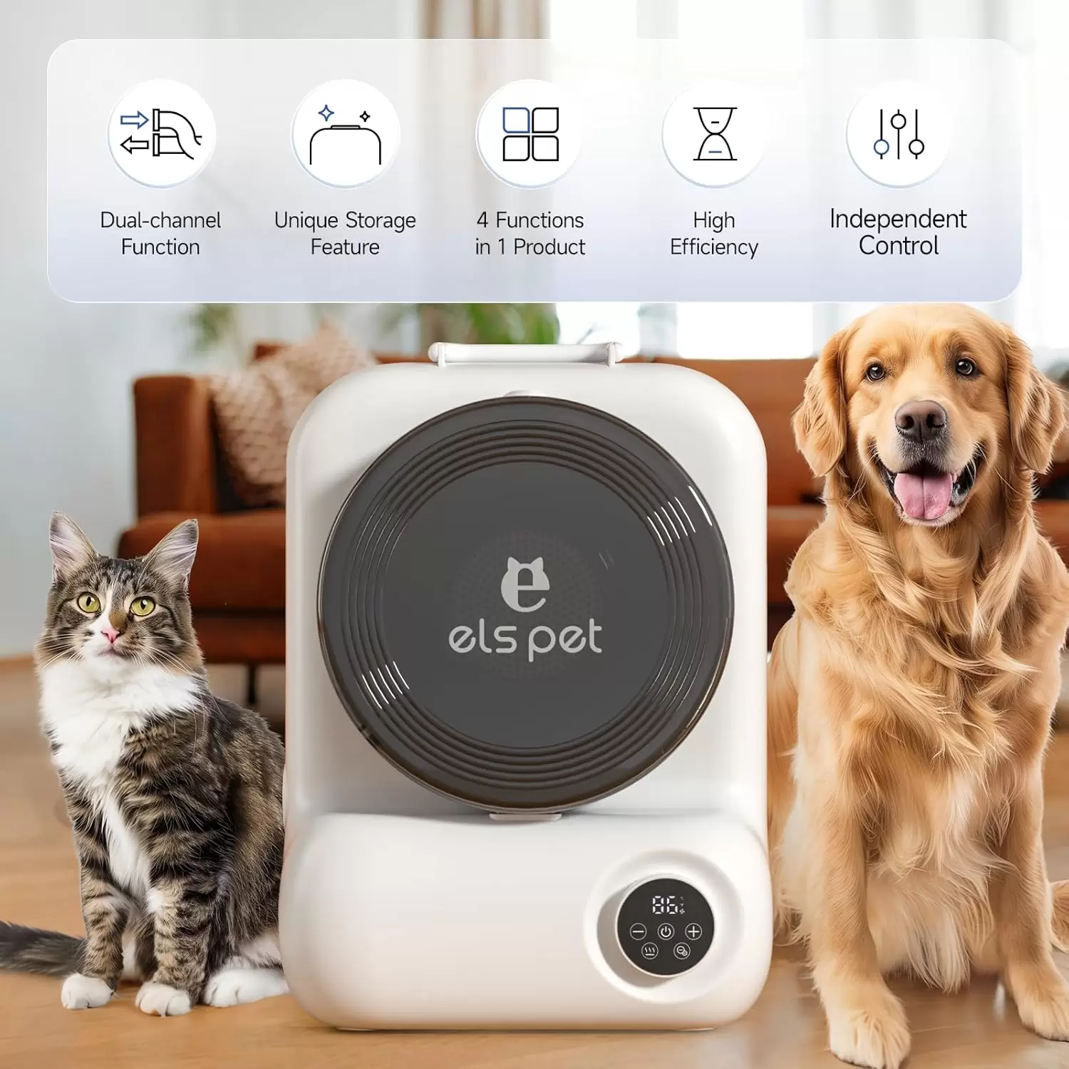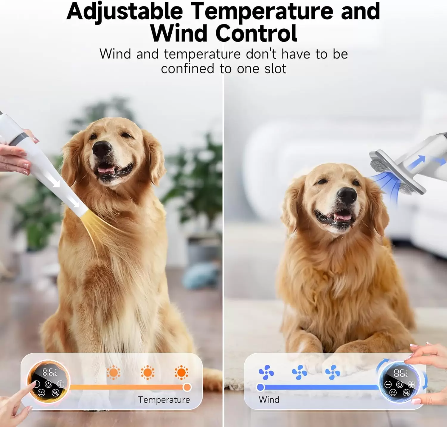 CONTROL FLEXIBLE DEL VIENTO Y LA TEMPERATURA: La aspiradora de aseo para perros tiene una pantalla inteligente para controlar el viento y la temperatura. El viento y la temperatura del producto se controlan de forma independiente. Podemos ajustar la temperatura dentro del rango de 86°F-158°F sin ser afectados por el viento. El viento también se puede ajustar en cinco posiciones sin verse afectado por la temperatura. Podemos combinar los modos de viento y temperatura según nuestras preferencias.