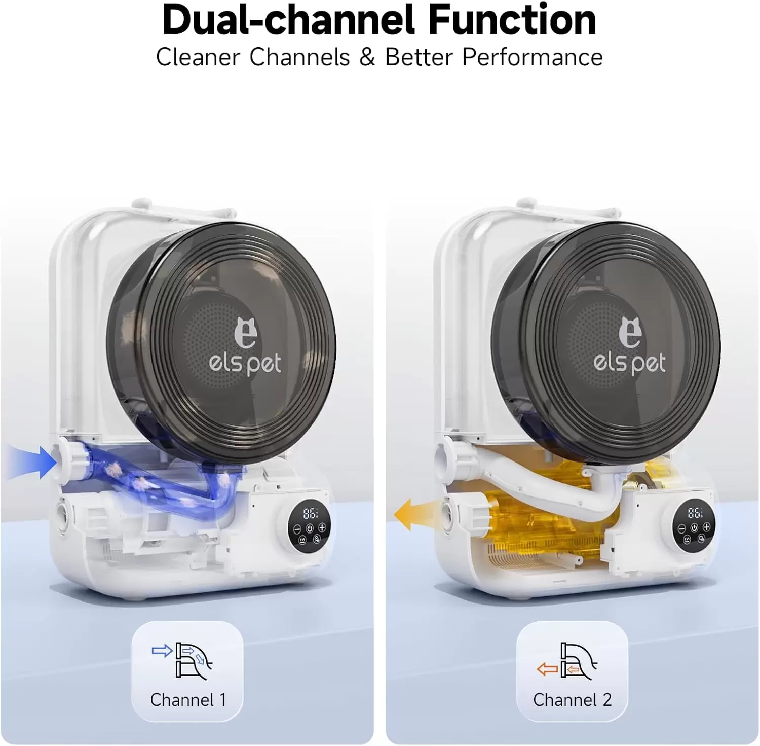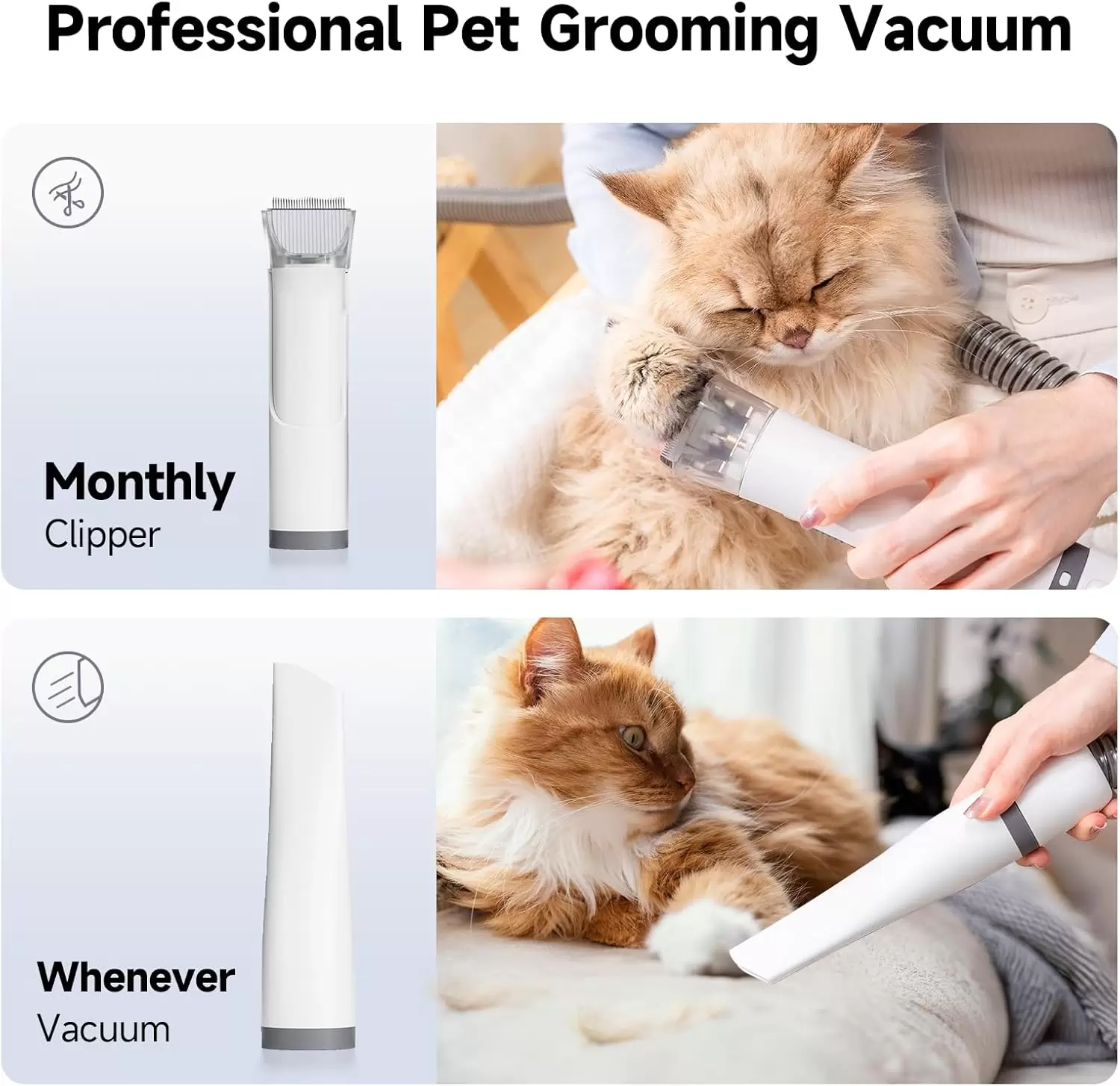 Función de doble canal: el kit de aseo para mascotas tiene dos canales diferentes. Un canal se usa para soplar a nuestros amigos peludos después de que se han bañado. El otro canal se puede utilizar para succionar el cabello después de que terminemos de acicalar las mascotas. Dos canales con diferentes propósitos pueden traernos un kit de aseo de mascotas más limpio y de mejor rendimiento.