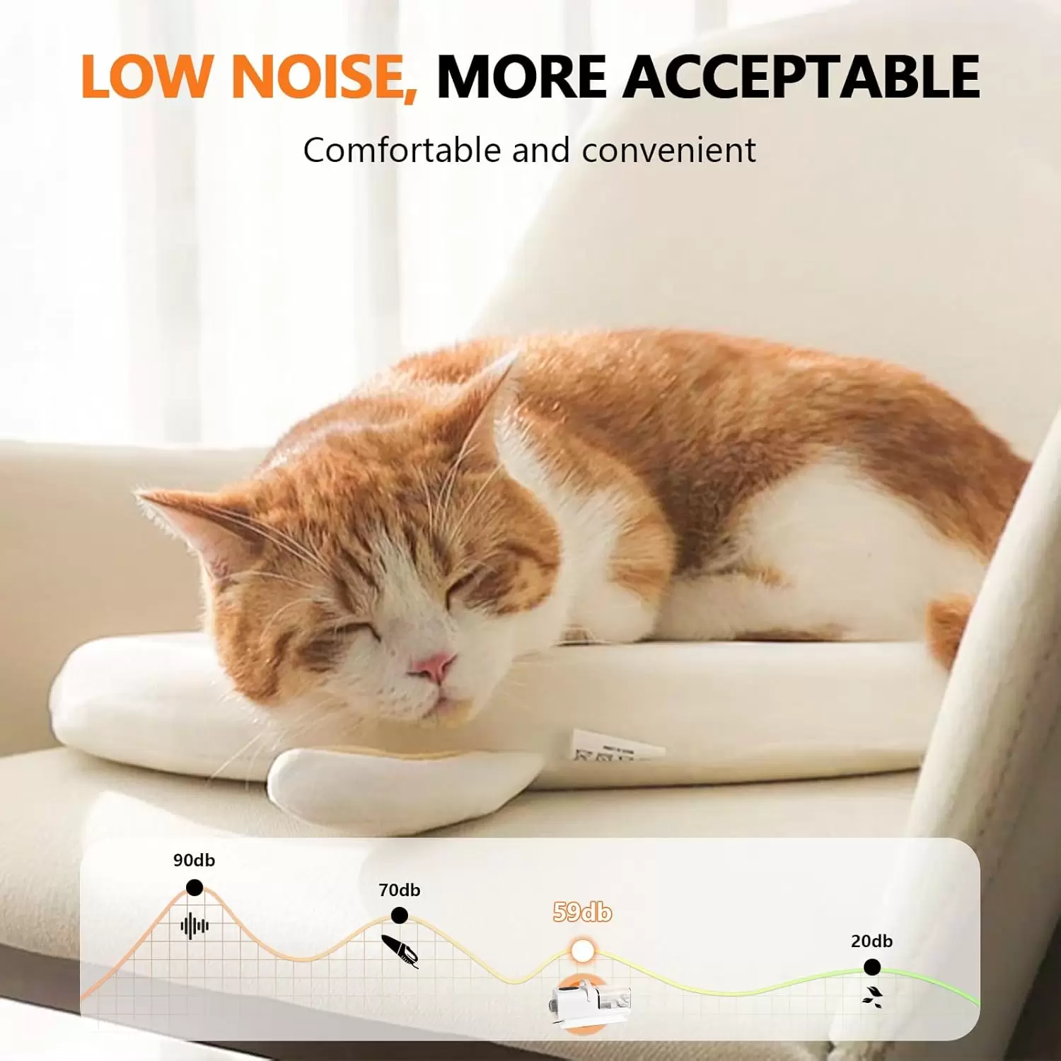 Diseño de bajo ruido: el sonido de trabajo es tan bajo como 59db. Puedes elegir el nivel de succión de acuerdo con la tolerancia de tu mascota al ruido, evitando que las mascotas se sientan asustadas y permitiéndoles disfrutar del proceso de aseo más cómodamente. La manguera extendida de 4.9 pies puede mantener a las mascotas alejadas de la máquina, lo que no hará que las mascotas se sientan incómodas o entren en pánico, por lo que es más adecuada para gatos o perros sensibles.