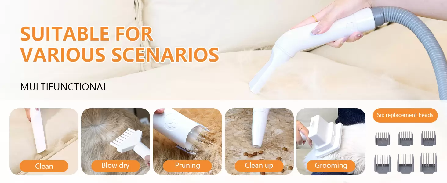Kit de aseo para perros 11 en 1: La depilación, la limpieza, el secado y el recorte se pueden hacer en casa. Los cepillos de belleza pueden eliminar suavemente el pelo suelto y el cabello pegado a la ropa de las mascotas; los cortadores de perros con seis peines ajustables proporcionan un recorte preciso para el cabello de diferentes longitudes y tipos; se pueden utilizar boquillas de diferentes formas y tamaños para recoger el cabello de sofás, grietas, alfombras y suelos. Un secador de pelo ayuda a los perros a secarse el cabello rápidamente. El kit profesional de aseo para perros no solo ahorra tiempo, sino que también ahorra dinero del 99% para ti.