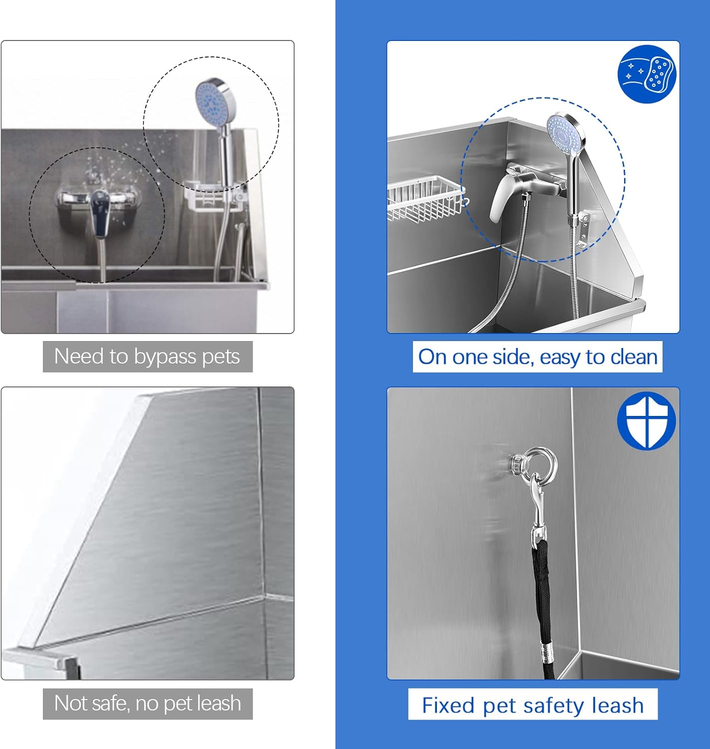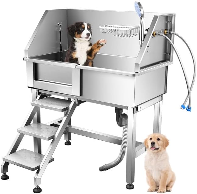 Material de acero inoxidable bien hecho: la bañera para perros está hecha de acero inoxidable 304 que es de alta calidad. El fregadero de aseo para mascotas resistente mide 34 x 18 x 41 pulgadas, ya que se adapta a varios tamaños de perros, especialmente perros en tamaño pequeño o mediano, y realiza un uso duradero debido a su material de acero inoxidable de alta calidad. La capacidad máxima es de aproximadamente 178 libras