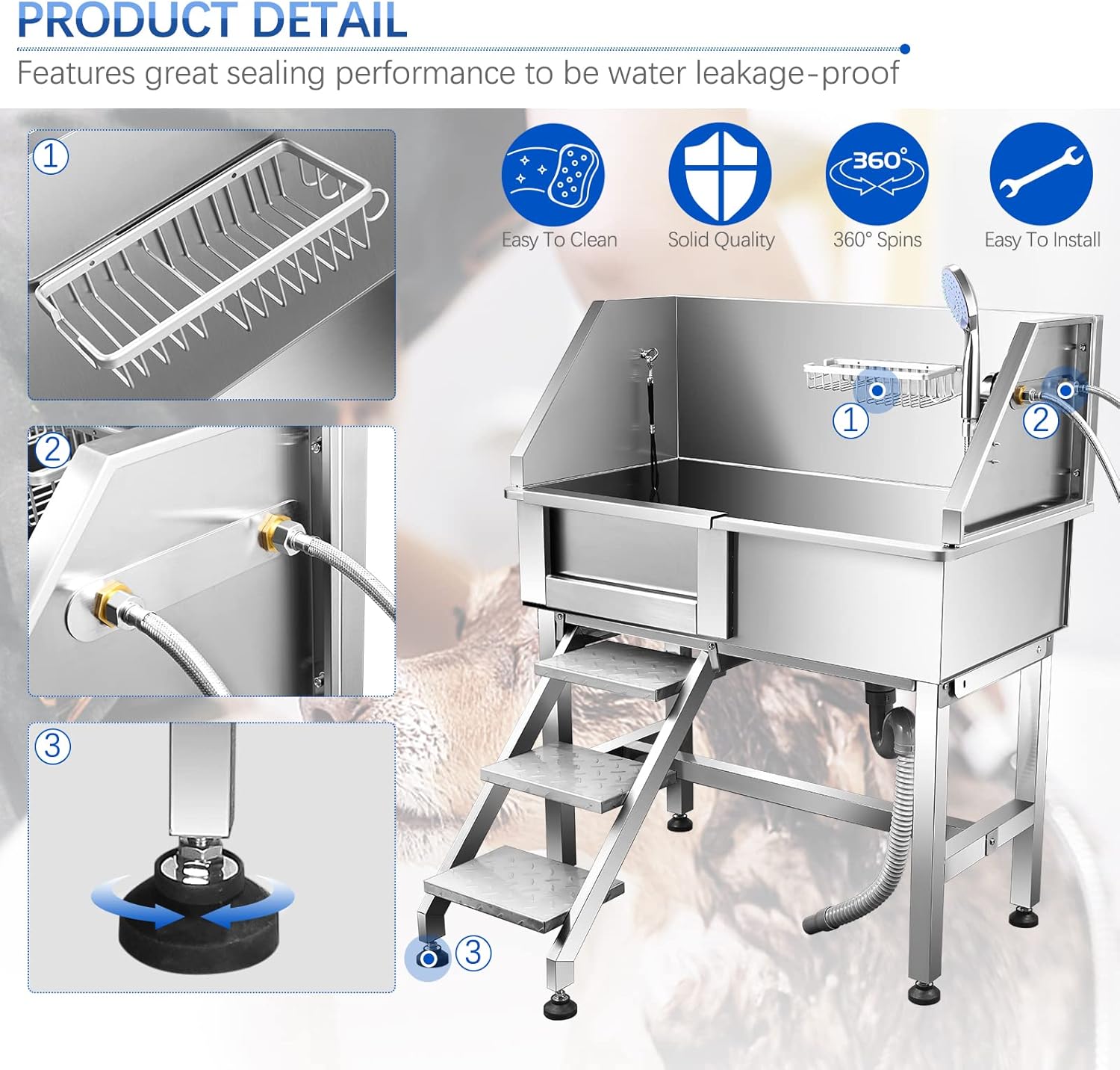 Rampa antideslizante y puerta deslizante: la escalera extraíble con superficie antideslizante ayuda a tus mascotas a entrar fácilmente en la bañera. Se puede almacenar fácilmente cuando no está en uso. La puerta es fácil de abrir y cerrar. El gran efecto de sellado hace que esta bañera sea una solución ideal para el aseo del perro.