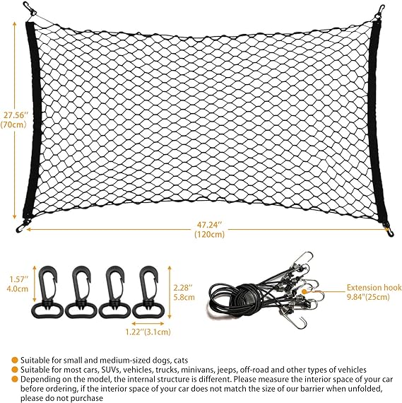 La red para perros es adecuada para perros y gatos pequeños y medianos. La barrera para auto para perros es adecuada para la mayoría de automóviles, SUV, vehículos, camiones, minivans, todoterreno y otros vehículos. Debido a los diferentes modelos de automóvil, la estructura interna es diferente. Antes de comprar, verifique el interior de su automóvil en busca de ganchos para colgar la barrera del automóvil para perros. El tamaño de la barrera para perros es: 47.24 x 27.56 pulgadas, mide las dimensiones internas de tu automóvil antes de comprar.