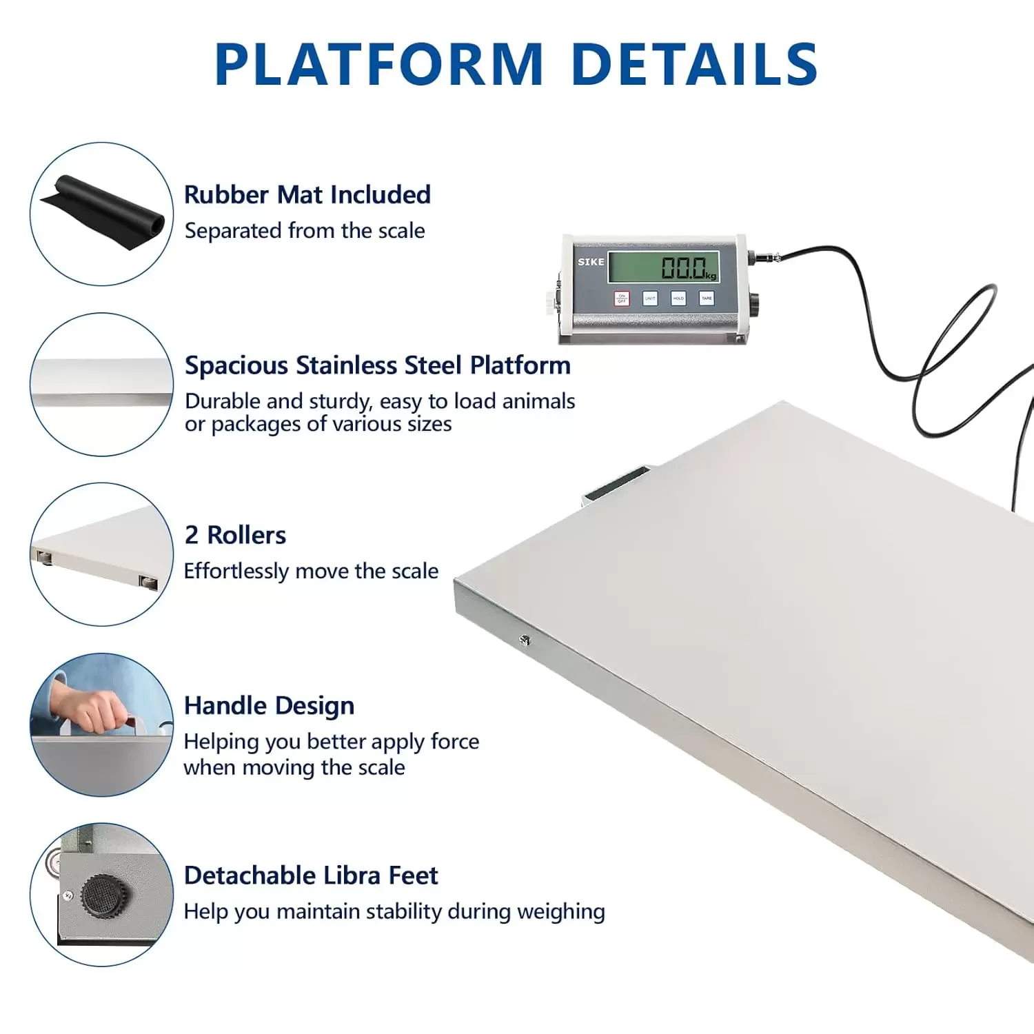 Modo de pesaje animal: la báscula de plataforma SIKE tiene un modo de pesaje animal que garantiza una lectura estable cuando los animales se mueven. Bajo este modo, una vez que el pesaje está bloqueado, permanecerá automáticamente bloqueado el peso durante unos 10 segundos