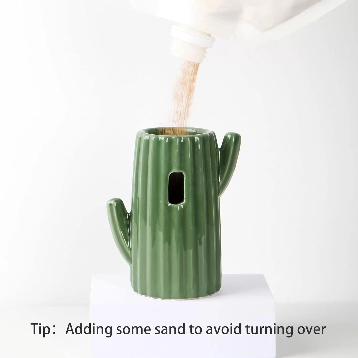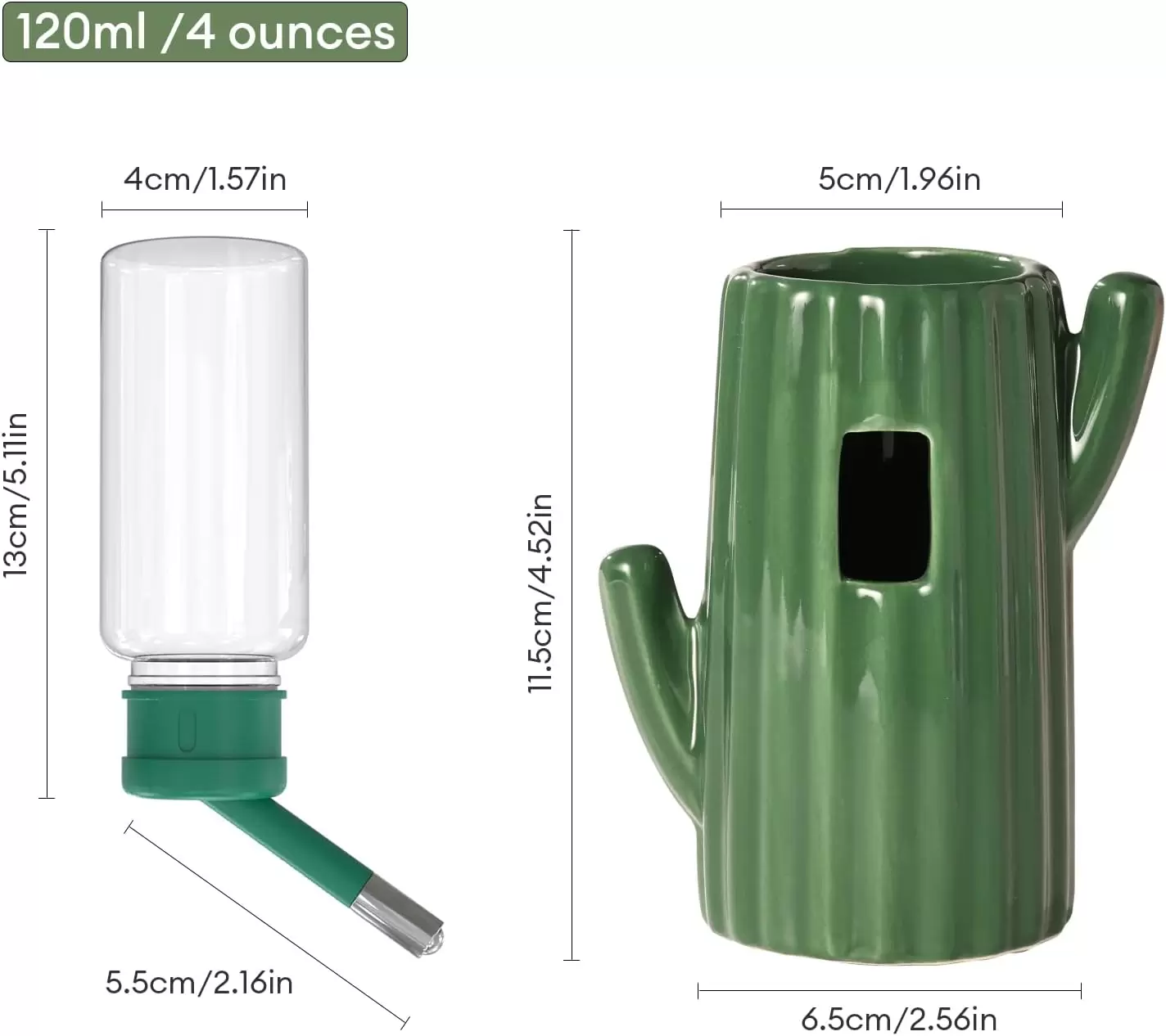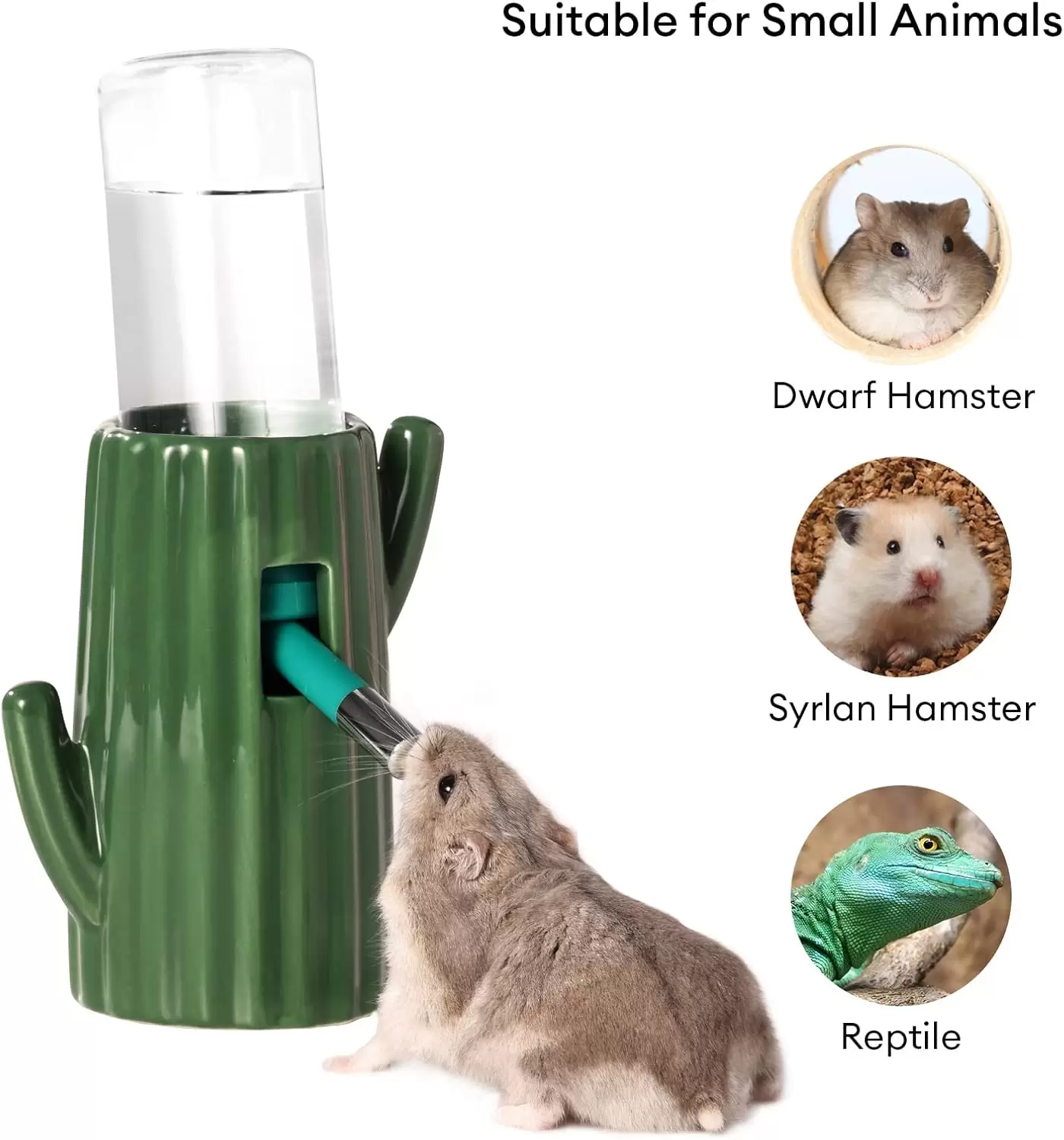 Bebedero de cerámica estable con diseño de cactus. Incluye botella antifugas de 118 ml. Ideal para simular un hábitat de desierto en jaulas de hámster y jerbos.
