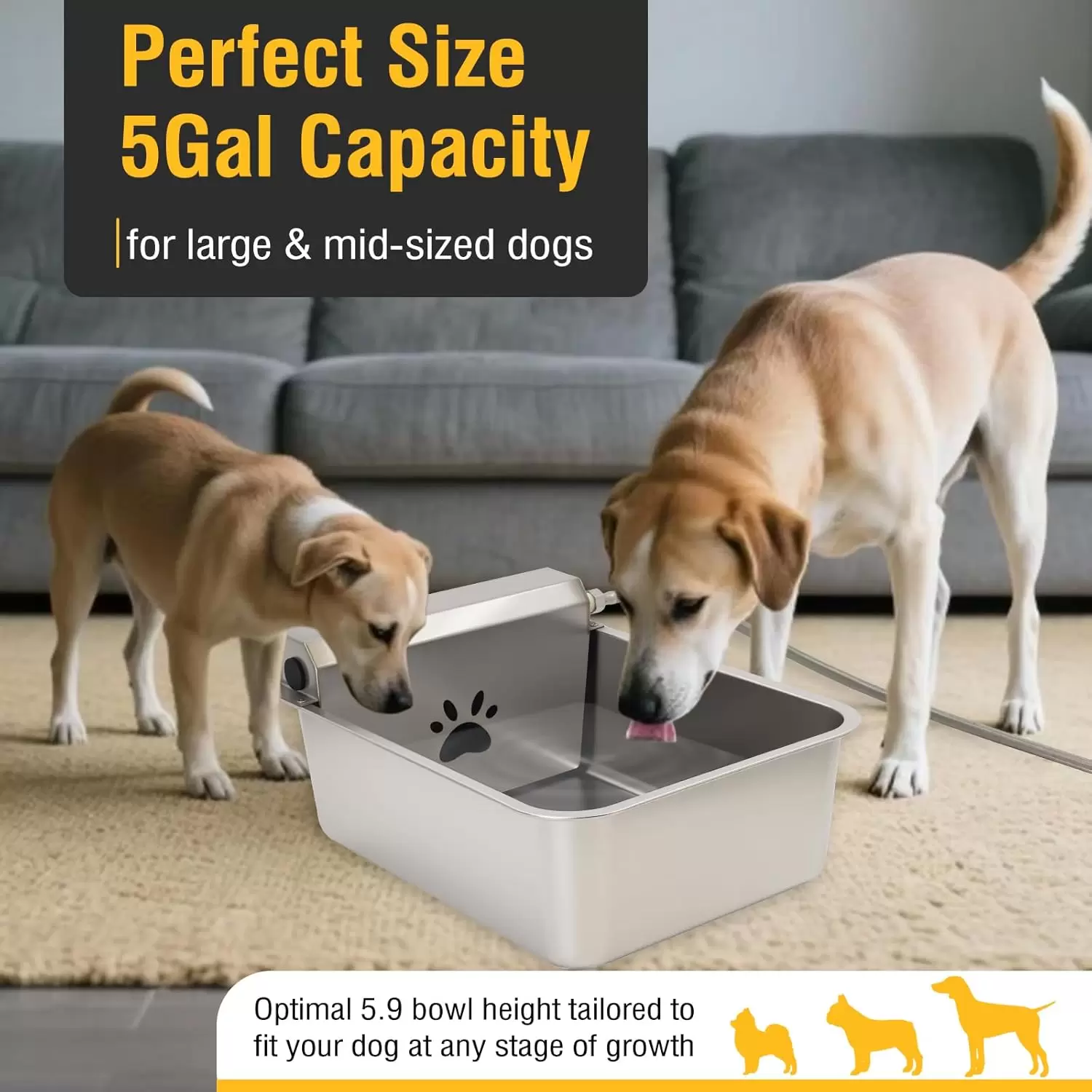 Bebedero de 19 litros para perros y gatos. Acero Inoxidable 304 con desagüe inferior para limpieza rápida. Llenado continuo automático, ideal para hogares con varias mascotas.