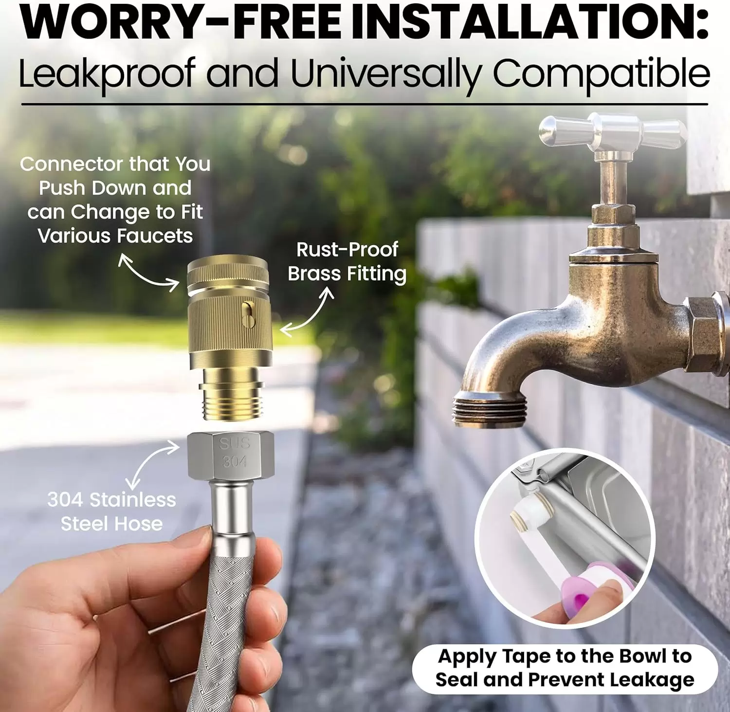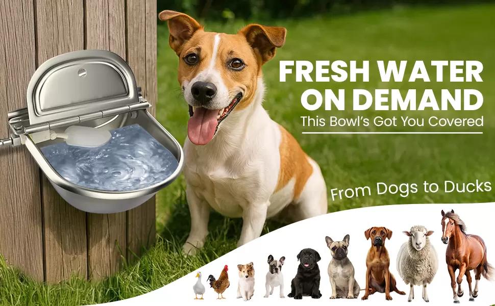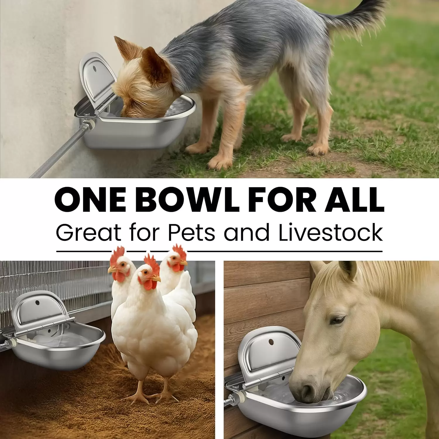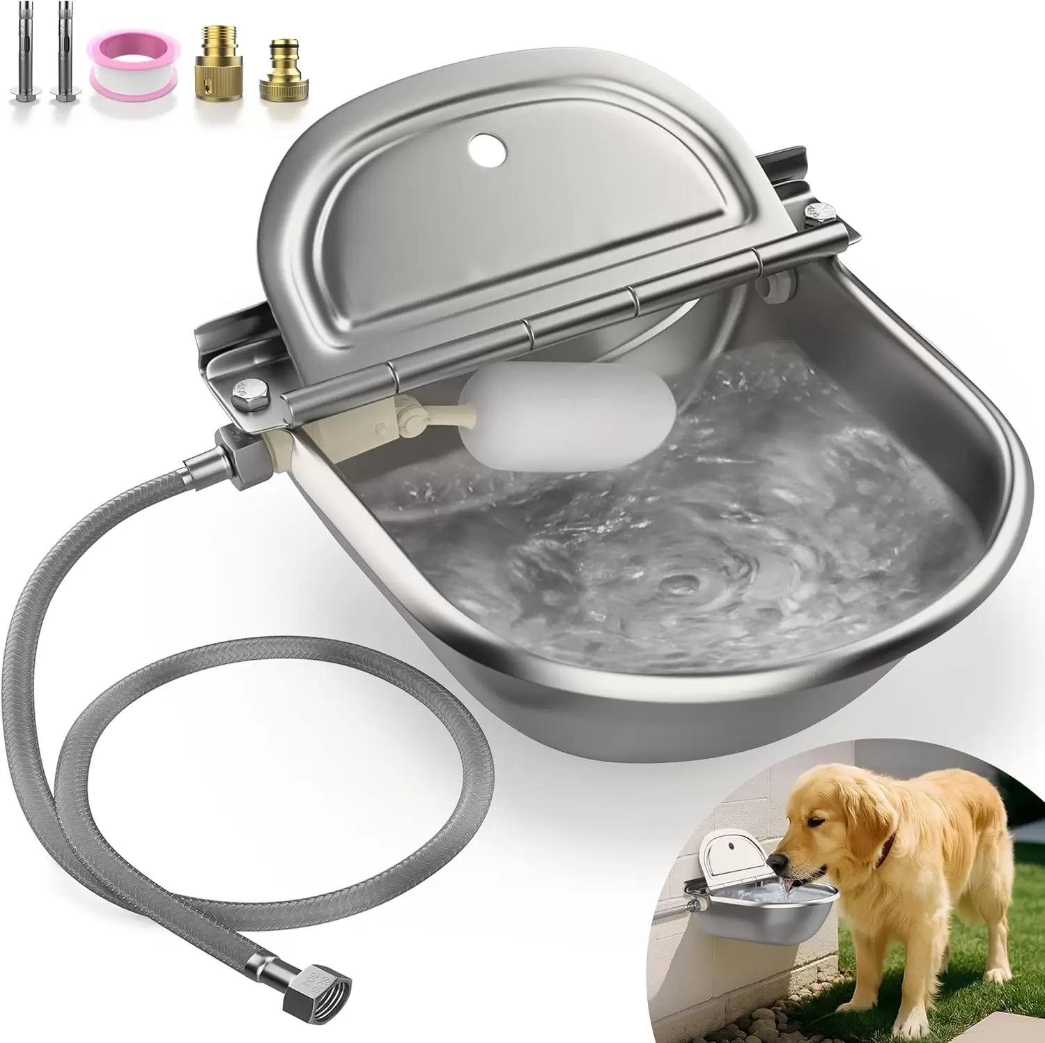 Se conecta directo a tu manguera de jardín. Bebedero automático de acero inoxidable 304. Incluye desagüe para limpieza fácil y kit de instalación completo. Ideal para perros y ganado.