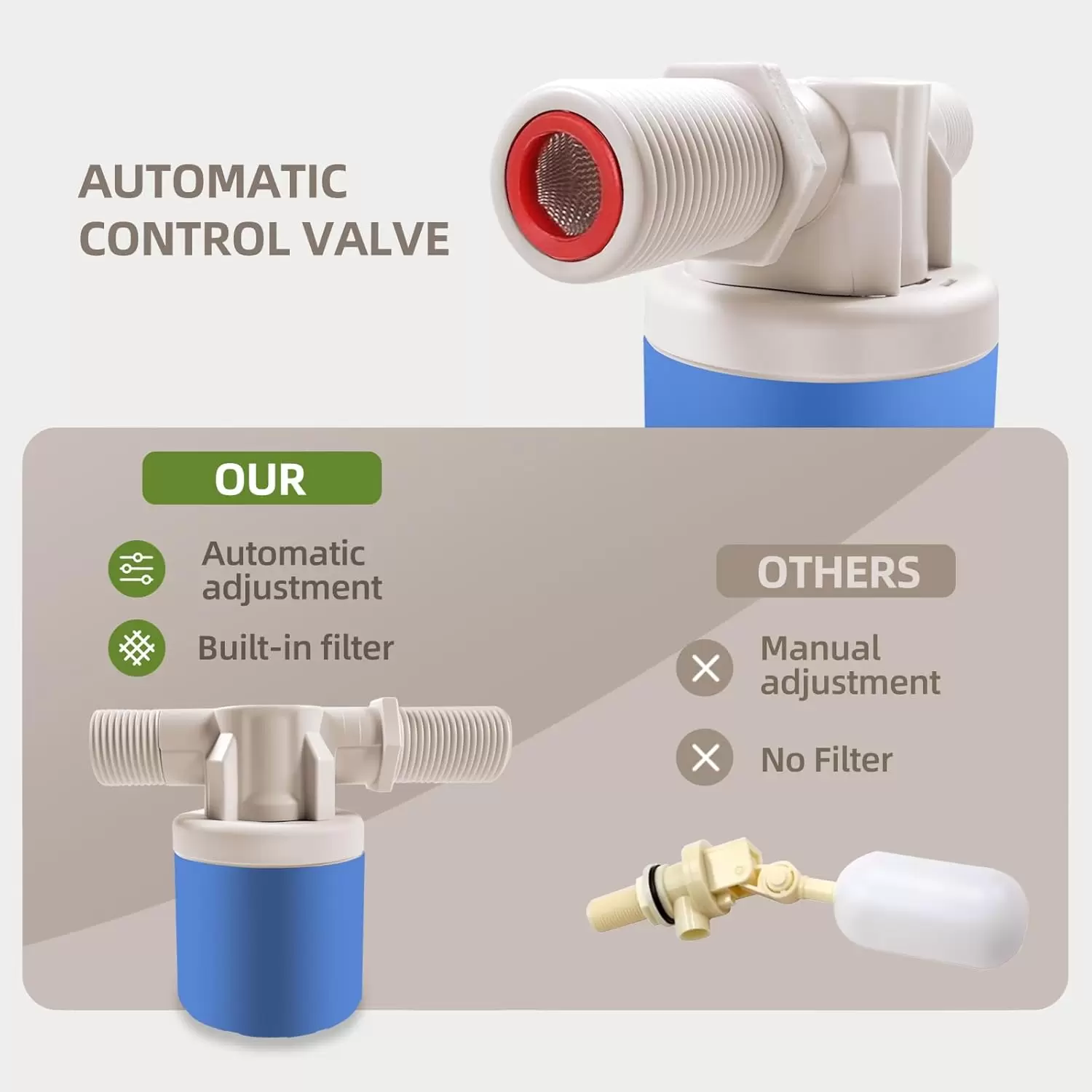 Auto-Relleno: Válvula de flotador para nivel constante de agua.