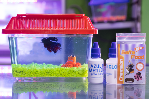 Incluye: Betera mini, Anticloro, Alimento, Pez betta, Grava, palmera decorativa e instrucciones.