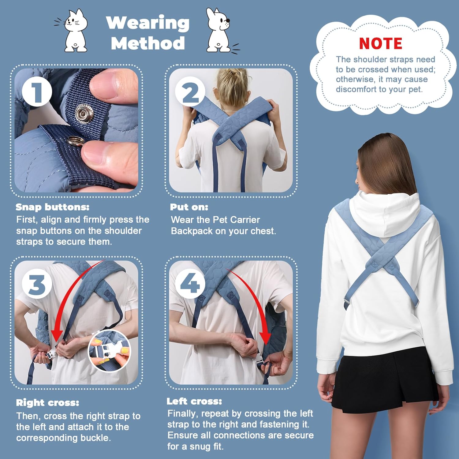 Diseño de múltiples bolsillos: nuestra mochila transportadora para mascotas está equipada con múltiples bolsillos, incluyendo dos bolsas laterales y bolsillos delanteros y traseros con cremallera, ofreciendo un amplio almacenamiento para artículos esenciales como aperitivos, bolsas de basura, tu cartera, teléfono o llaves. Todo lo que necesitas está al alcance de la mano. (Fácil de usar: Si encuentras las correas demasiado largas, crúzalas cuando las uses para evitar que se resbale de los hombros. Para obtener instrucciones paso a paso, consulte la Figura 4)