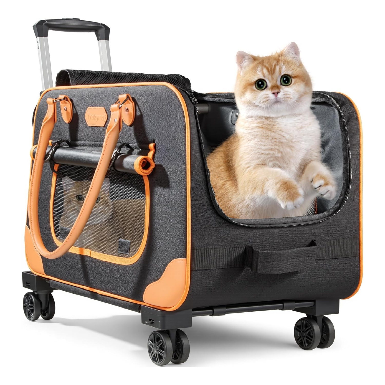 Seguro y cómodo: la base gruesa del transportador de mascotas con ruedas es muy fuerte y no se pliega fácilmente, equipada con una cómoda almohadilla suave para dar a tu mascota una sensación completa de seguridad y comodidad. Y la correa de seguridad interior evita que tu mascota se escape. Bolsillo lateral de almacenamiento para golosinas y juguetes para mascotas.