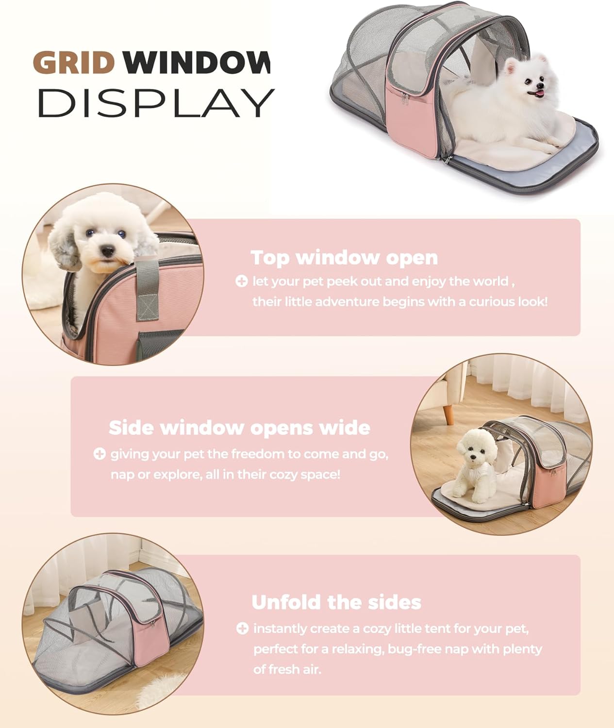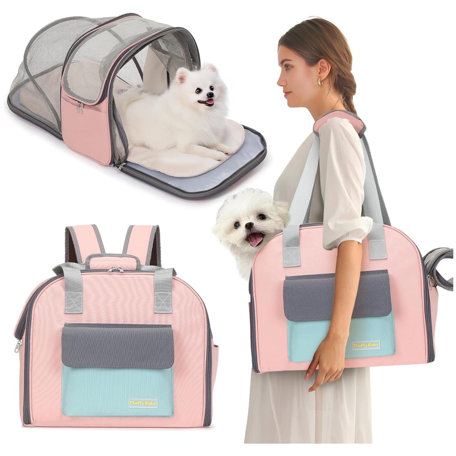 Características interactivas y prácticas: El transportador incluye una claraboya interactiva transpirable, lo que permite a su mascota disfrutar de la vista e interactuar con el entorno. También cuenta con una correa de equipaje para una fácil fijación a tu maleta, un diseño de cremallera inferior para el almacenamiento diario y un diseño de múltiples bolsillos de 360° con seis bolsillos, uno frontal, dos lados y tres traseros, para guardar suministros para mascotas.