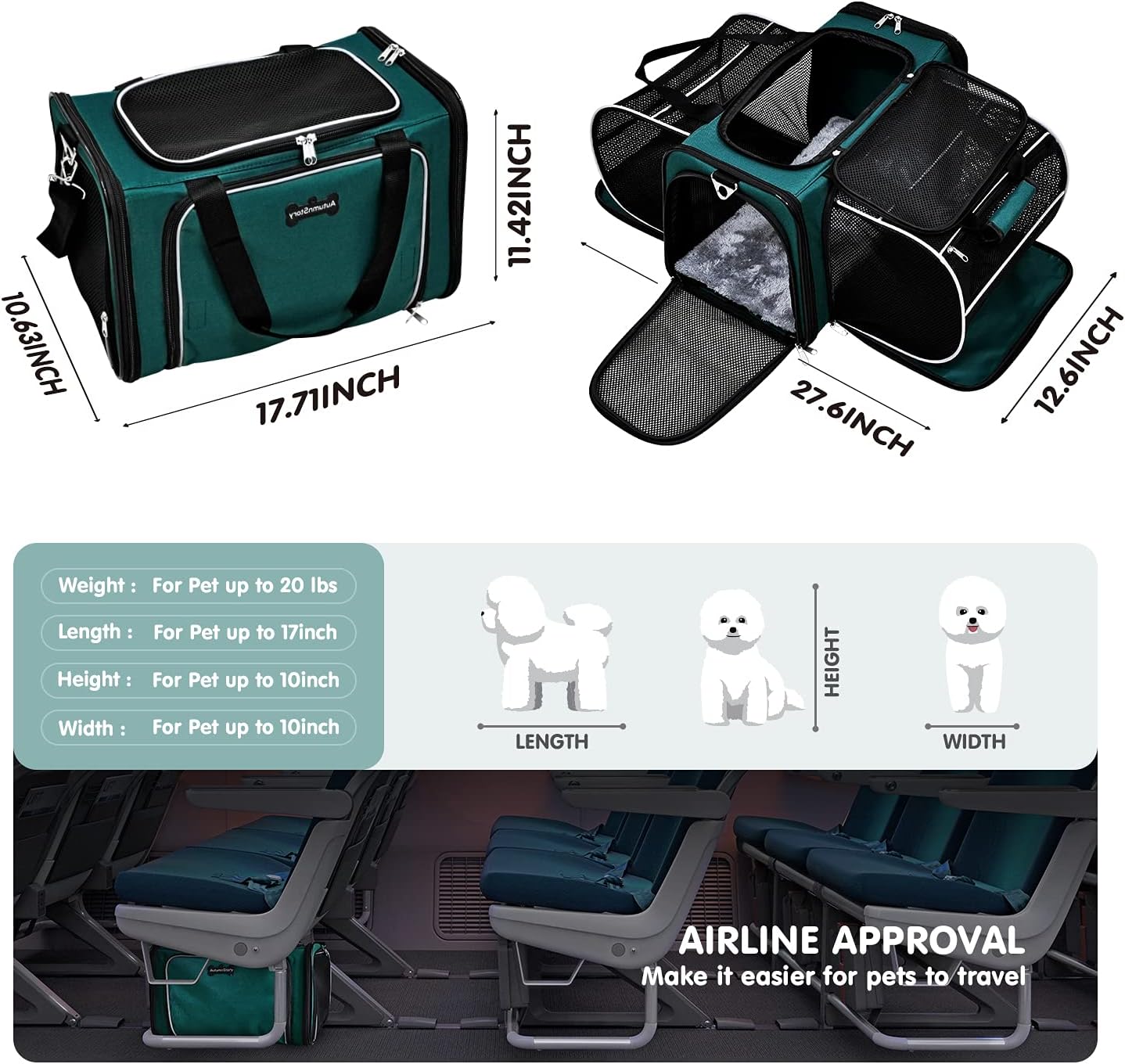 Aprobado por aerolíneas: con el diseño aprobado por la aerolínea TSA, el transportador de gatos AutumnStory mide 17.71 pulgadas de largo x 10.63 pulgadas de ancho x 11.42 pulgadas de alto mientras está plegado, se adapta a mascotas de hasta 20 libras (19.8 lbs), que tiene suficiente espacio para que las mascotas se paren o se den la vuelta. Nota: Está aprobado por la mayoría de las aerolíneas, pero no lo tome en Southwest Airlines o Alaska Airlines. Si no está seguro, comuníquese con la aerolínea con la que viaja para confirmar específicamente la aerolínea de tamaño aprobado para su vuelo.