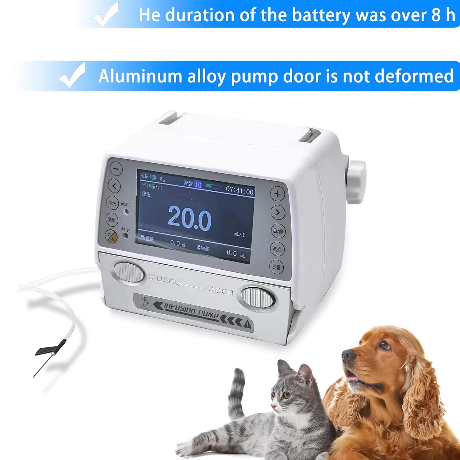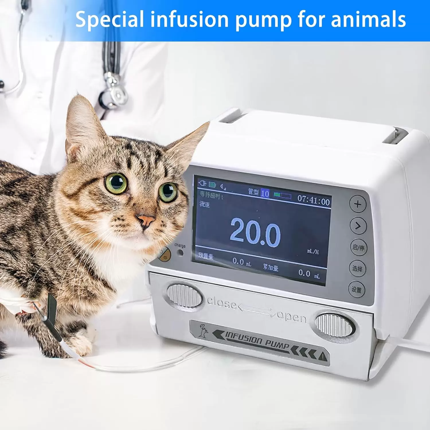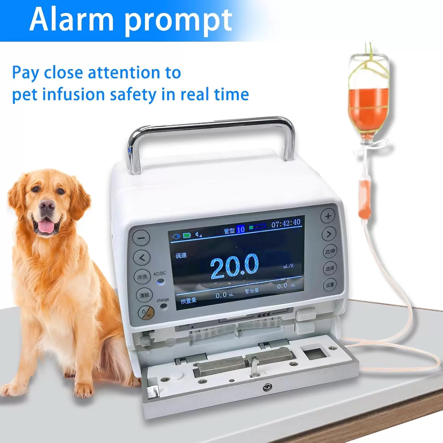 Bomba de infusión veterinaria portátil con alta precisión y pantalla LCD. Esencial para el control de fluidos y medicamentos en clínicas y hospitales de mascotas en todo Chile.