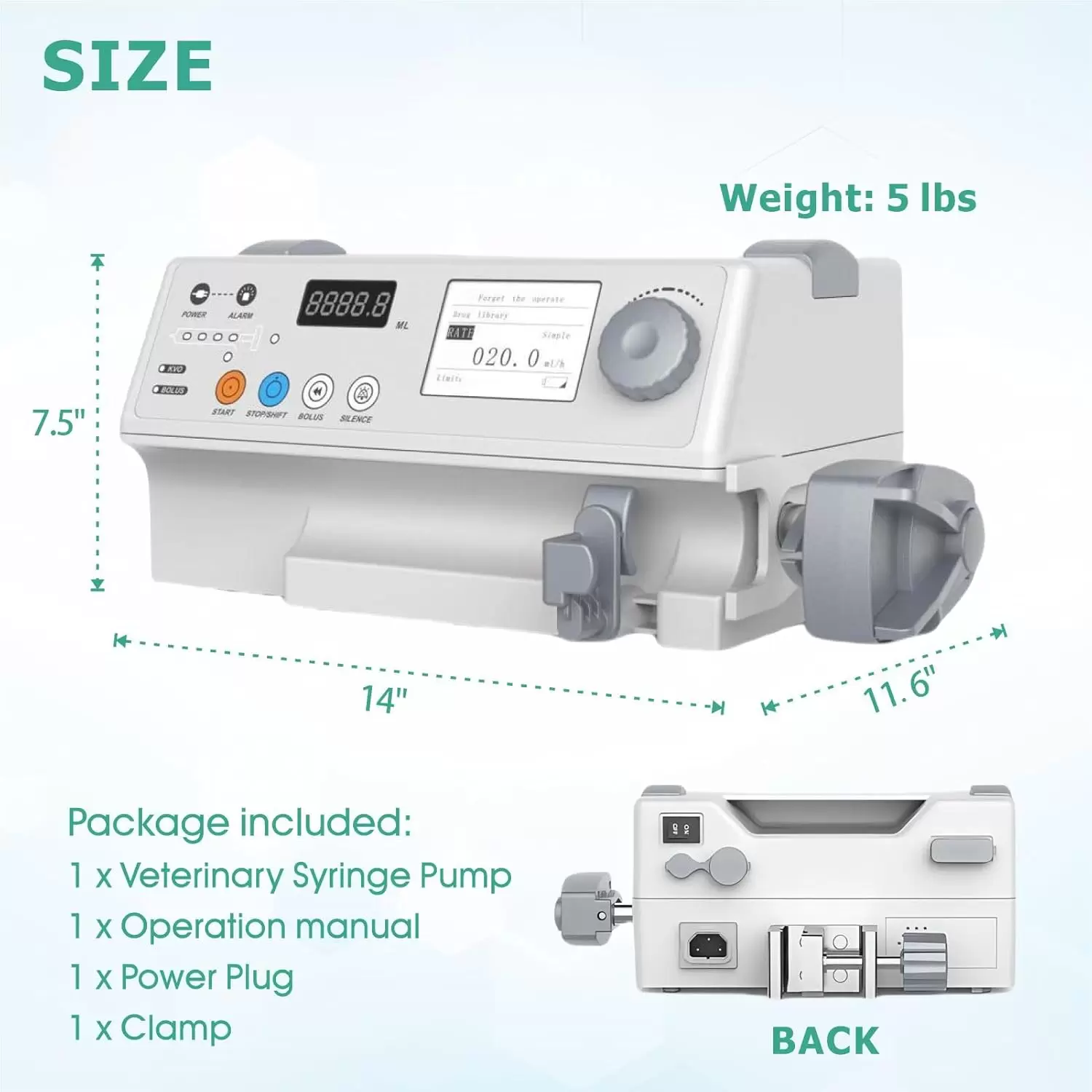 1 bomba de jeringa veterinaria, 1 manual de operación, 1 enchufe de alimentación, 1 abrazadera
