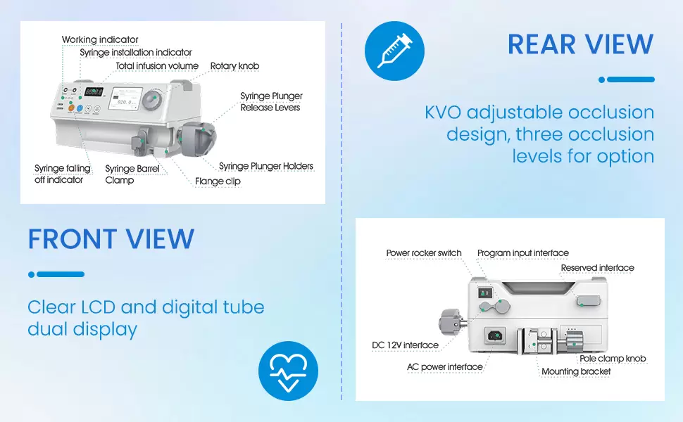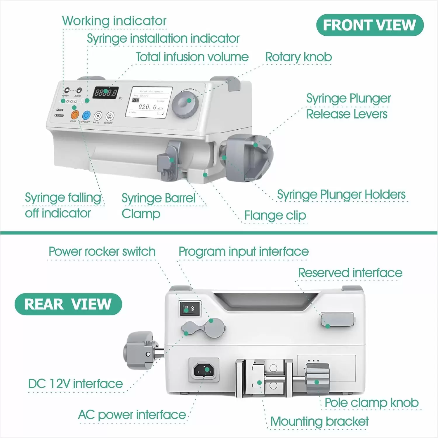 Las alarmas únicas de combinación de voz, palabra y luz pueden garantizar que el personal pueda responder rápidamente. Puede identificar de forma inteligente el tamaño y la capacidad de la jeringa y se puede usar con cualquier jeringa después de la calibración.