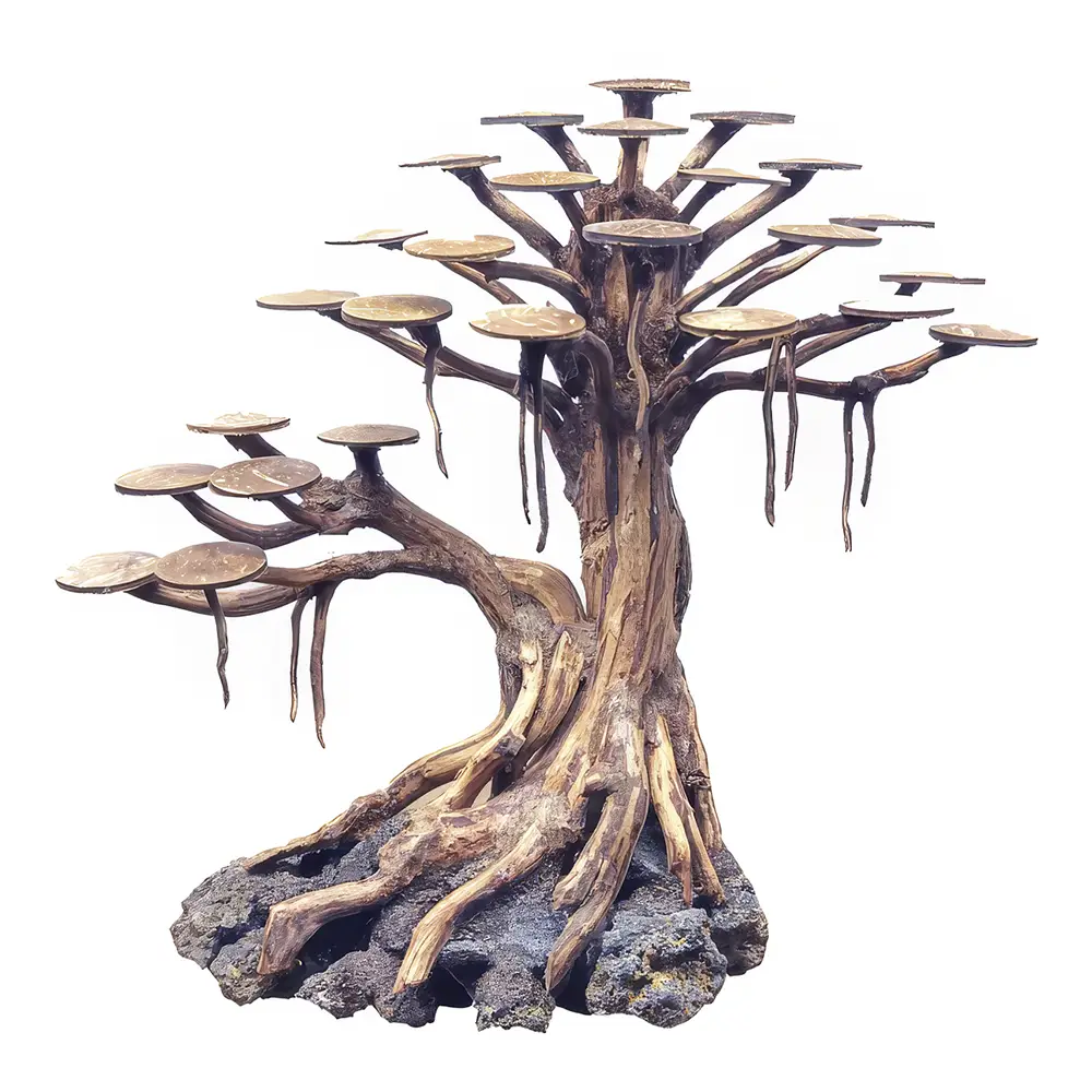 Hecho de madera de rasamala, imita fielmente la forma de un bonsái real.