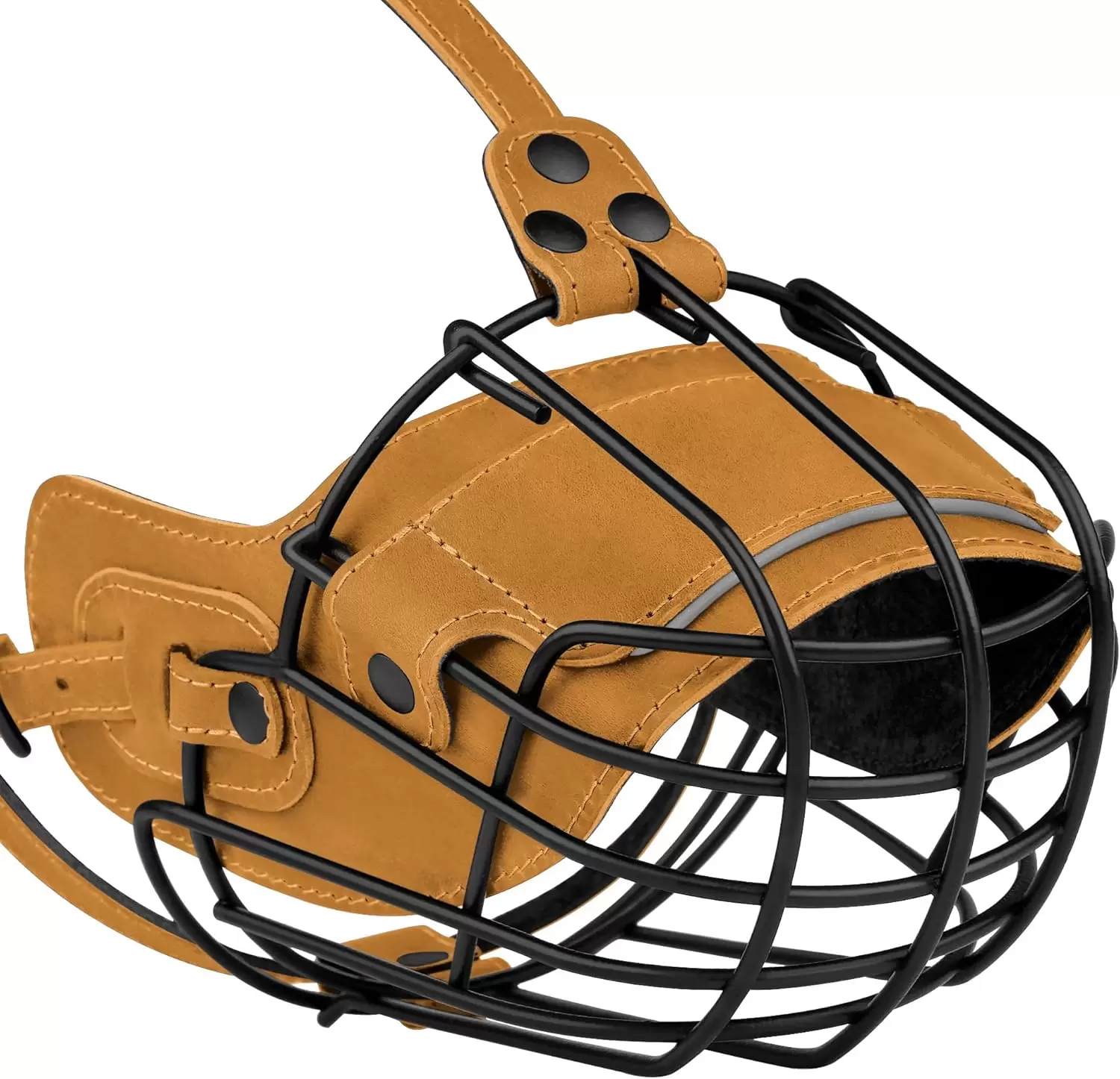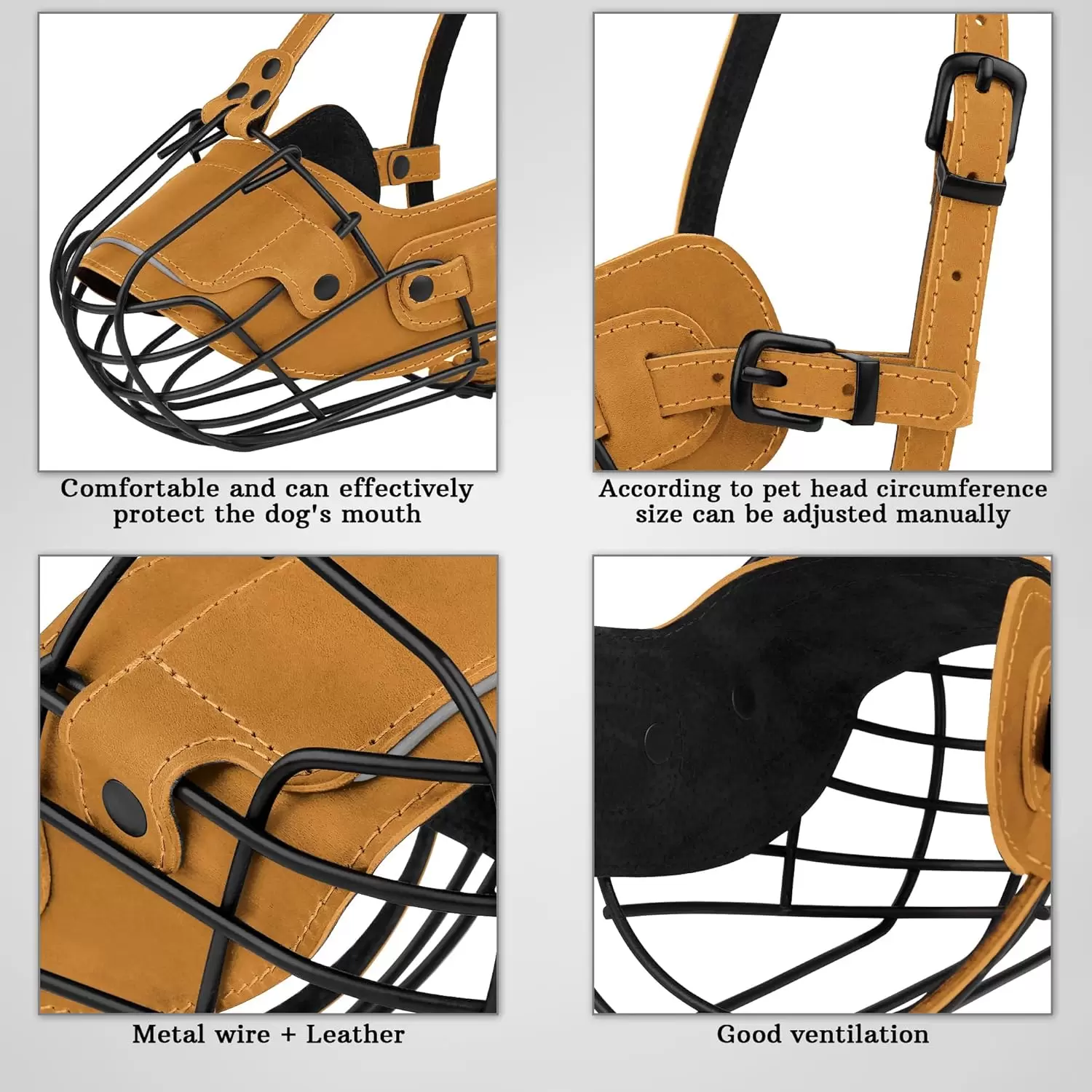 Correas de cuero ajustables: con correas de cuero ajustables, este bozal de cesta garantiza flexibilidad, ajuste seguro y visibilidad mejorada en condiciones de poca luz para mayor seguridad durante los paseos nocturnos. La construcción de metal lo mantiene en su lugar de forma segura sin ser fácilmente desalojado.