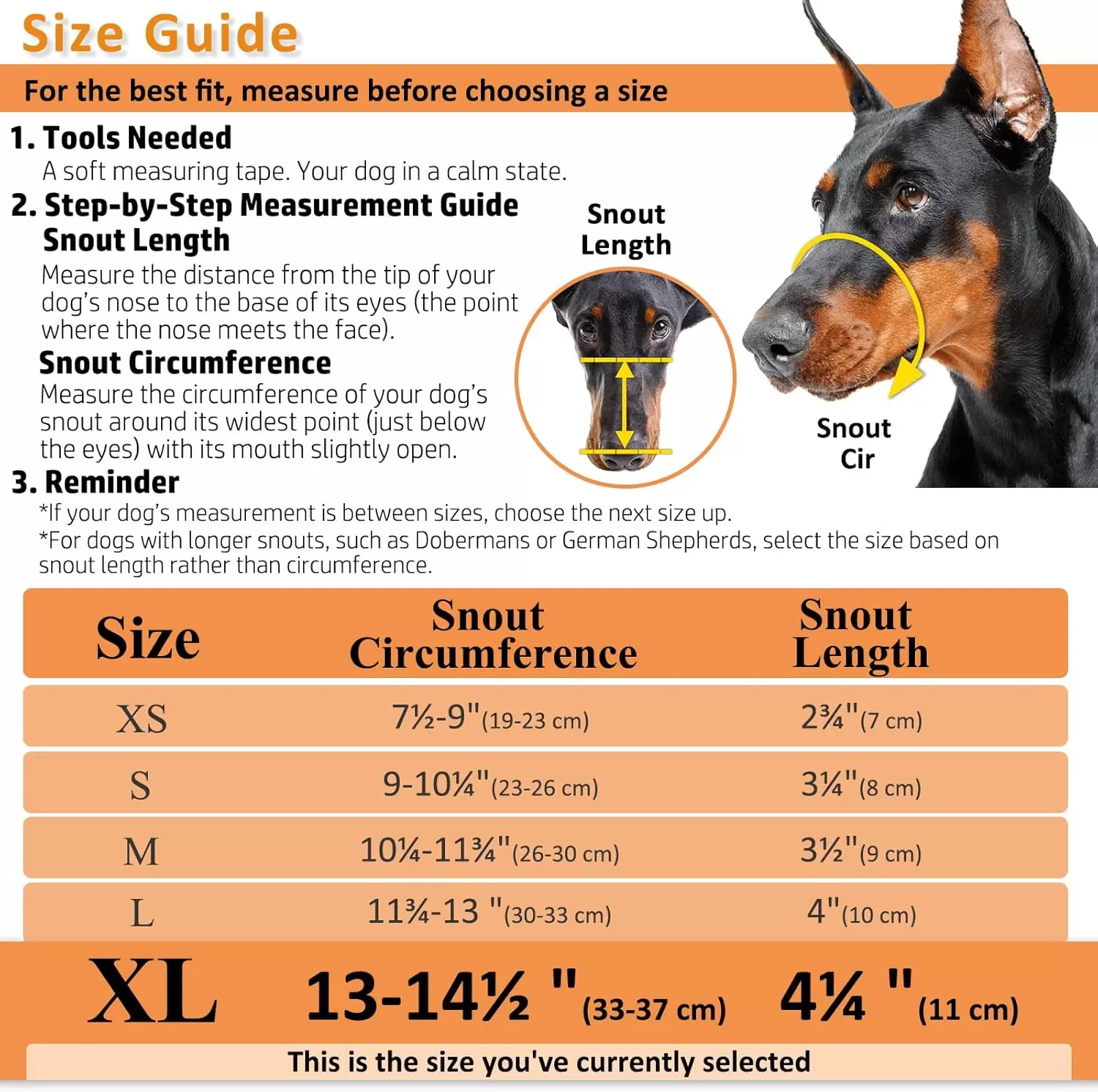 Ajuste perfecto para perros grandes: Esta opción Talla XL es ideal para razas grandes como pastores alemanes y labradores. Las razas enumeradas anteriormente son solo para REFERENCIA. Asegúrate de medir la circunferencia y la longitud del hocico de tu perro con precisión antes de comprar, y consulta la tabla de tallas. Un ajuste adecuado garantiza comodidad y eficacia