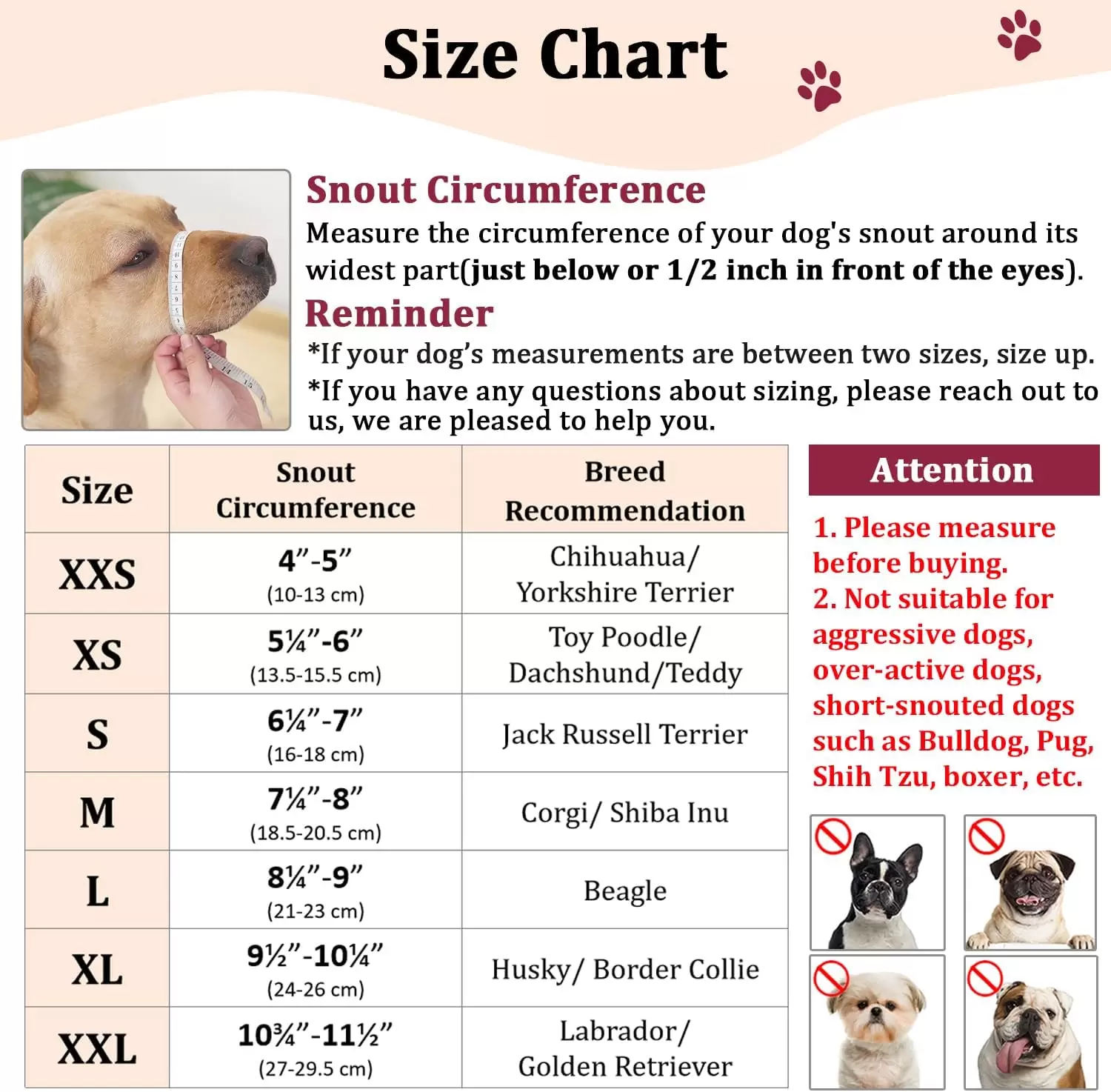 Múltiples opciones de tamaño: el bozal de malla Mayerzon para perros está disponible en 7 tamaños. El tamaño XXS (adecuado para circunferencias de hocico entre 4 y 5 pulgadas) es perfecto para razas como Chihuahua, Yorkshire Terrier, pero no se recomienda para perros de hocico corto como Shih Tzu, Pit Bull, Boxer, etc.