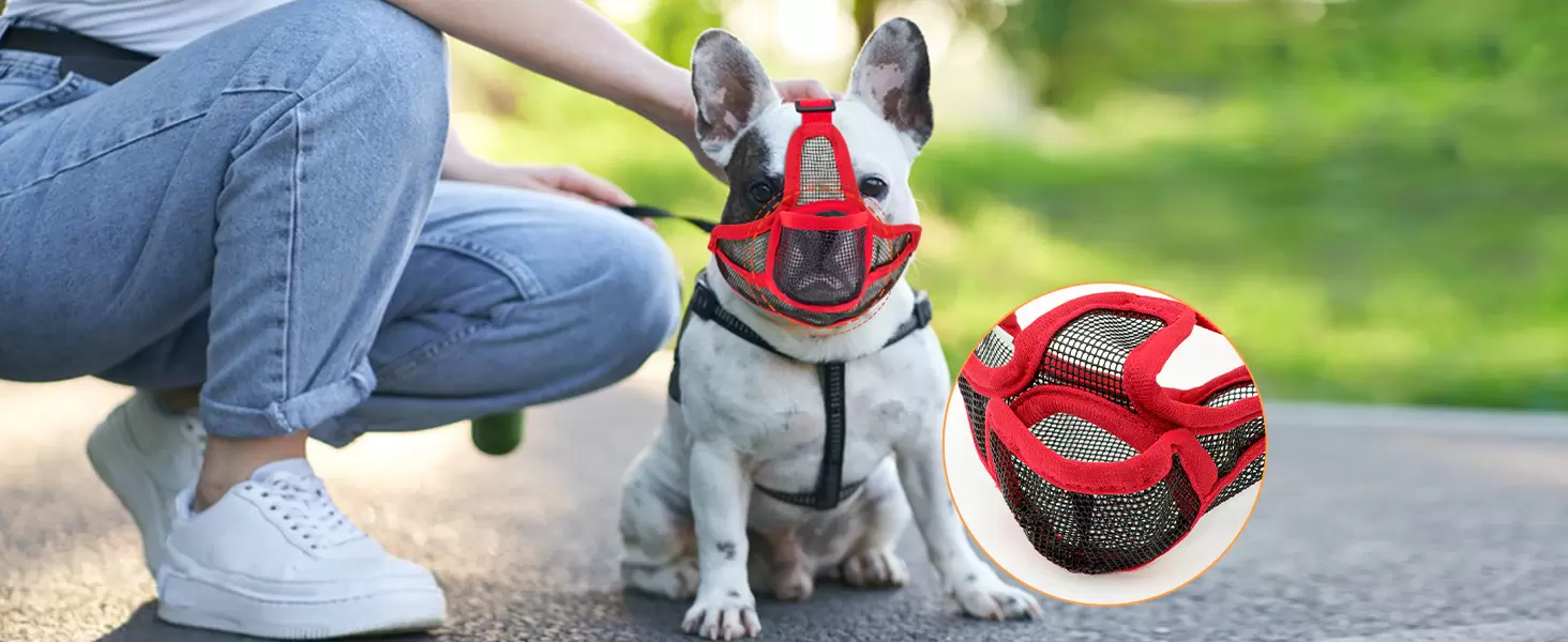 Un bozal de malla para perros de hocico corto en Chile. Es un bozal anti-mordidas, ideal para el entrenamiento y el aseo, y es apto para razas como Pug y Bulldog Francés.