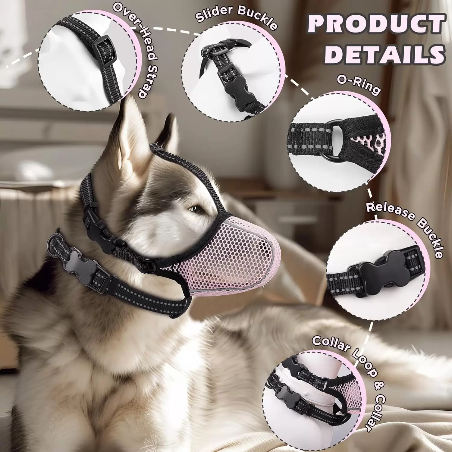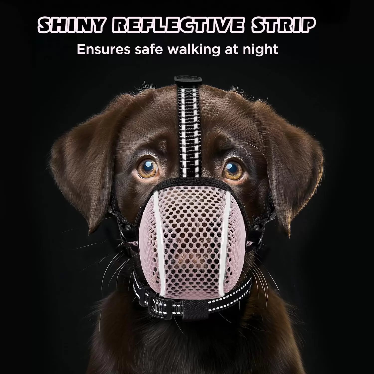 Bozal de seguridad y ajustable para perros: el bozal antiladridos tiene la correa para el cuello y la correa para la frente son ajustables. El deslizador es para asegurar la correa de la cabeza, mientras tanto puedes enhebrar la parte adicional de la correa del cuello a través de ella para ajustarla al tamaño más adecuado, evitar que se caiga. Los bordes reflectantes son seguros para caminar en la oscuridad. No dejes que tu perro use el bozal durante mucho tiempo sin tu supervisión.