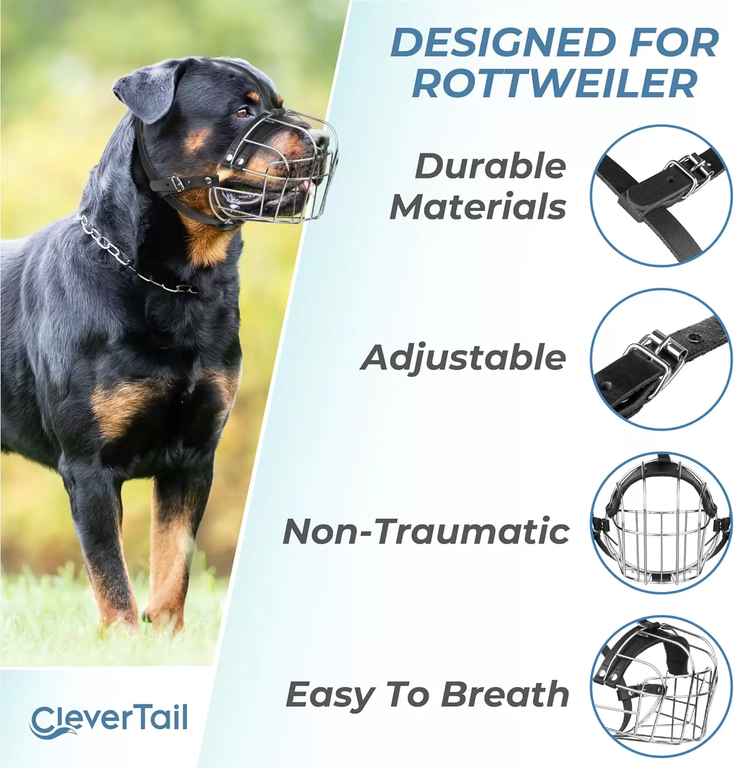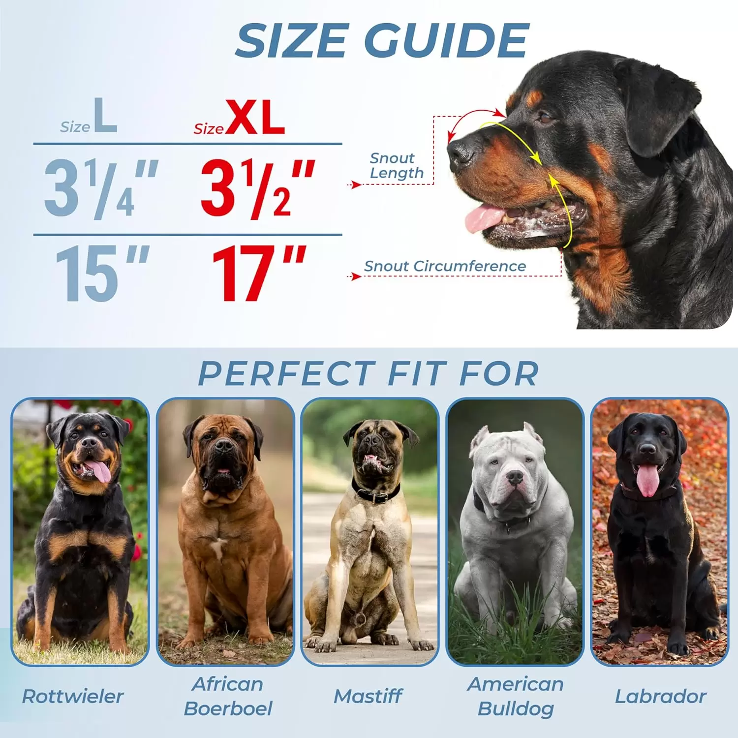 Razas compatibles: nuestro bozal antimordida de alambre está diseñado para adaptarse a Rottweiler, Cane Corso, Mastín, American Bully, Presa Canario, African Boerboel, Labrador, Bulldogs y otras razas grandes.