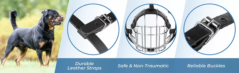 Correas de cuero ajustables: experimente la comodidad de correas de cuero flexibles y ajustables en nuestro bozal para perros grandes. El bozal para perros agresivos se mantiene firmemente en su lugar y no se puede quitar fácilmente.