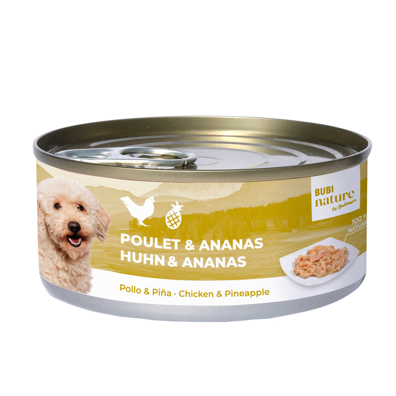 BUBIMEX NATURE DOG POLLO Y PIÑA es un alimento complementario húmedo para perros elaborado a partir de productos naturales seleccionados. Sin colorantes, ni conservantes.